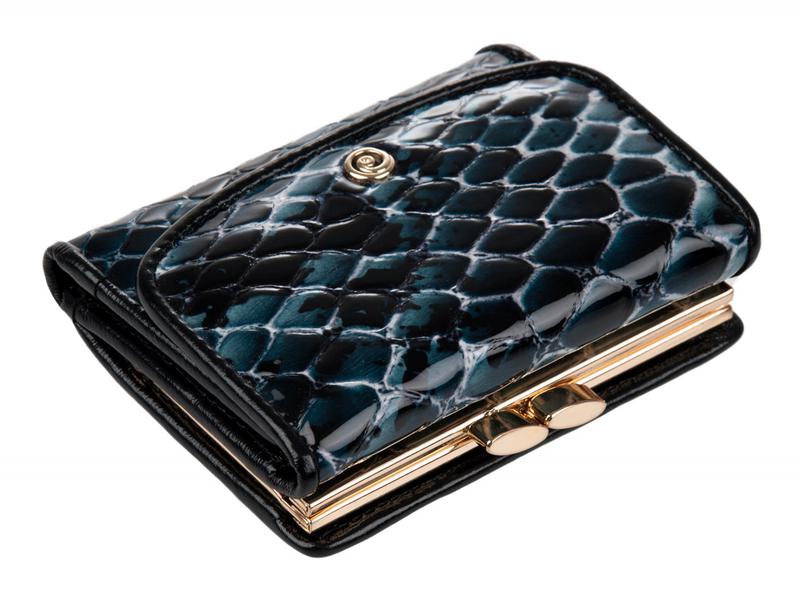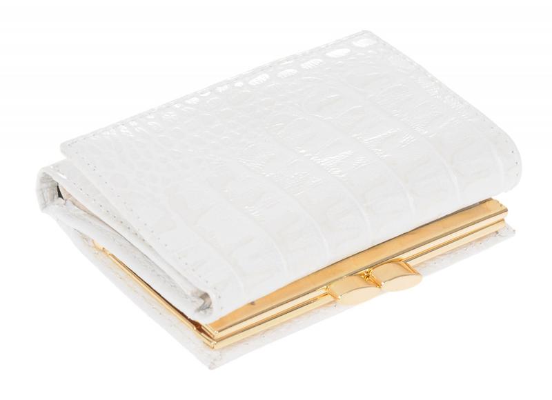 Портмоне женское в три сложения.Внутри имеет два отделения для крупных купюр.Отделение для кредитных карт.На внешней стороне задней стенке монетник на рамочном замке. Само изделие закрывается на кнопку.
