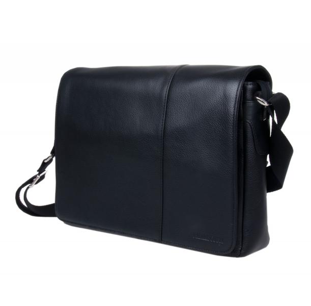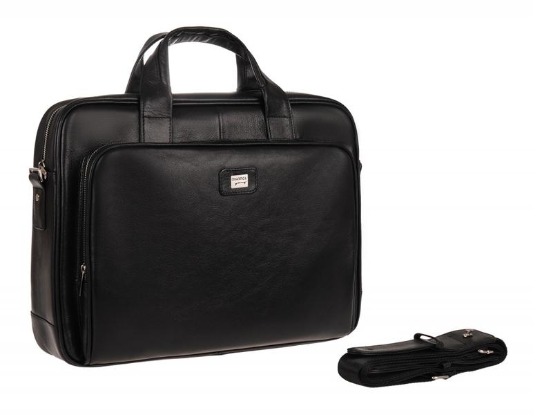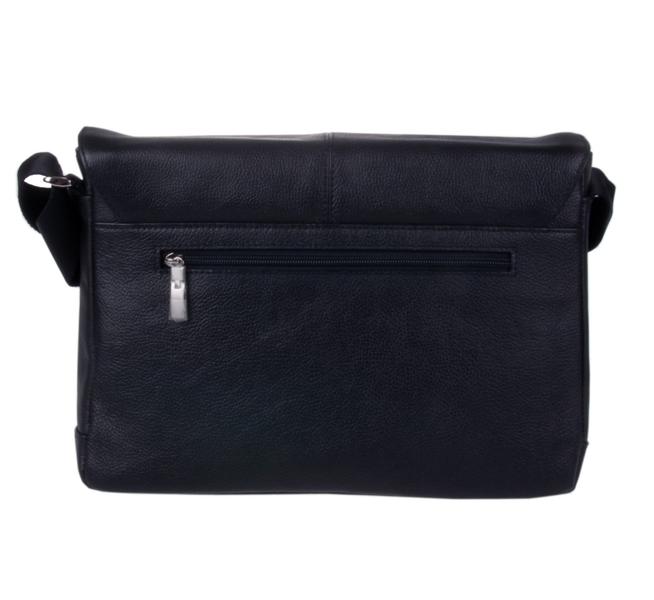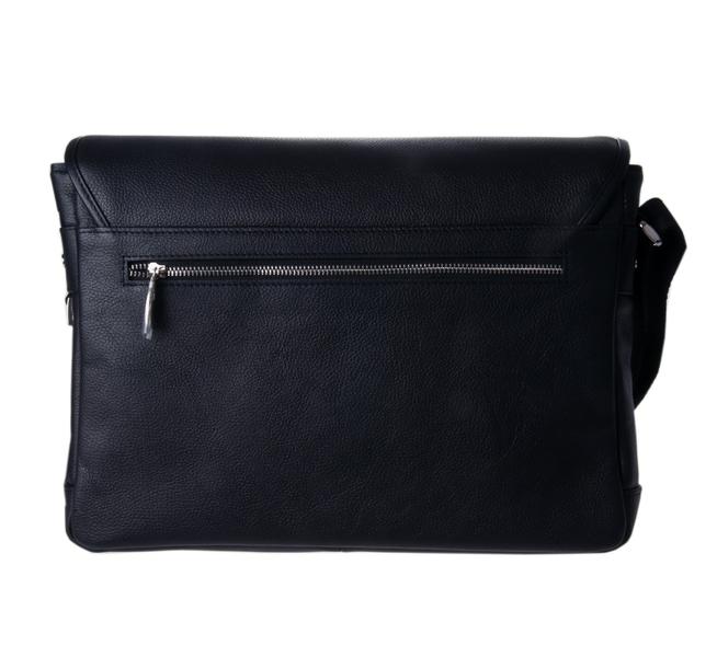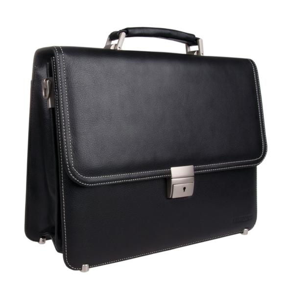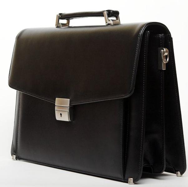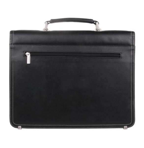 Портфель из мягкой кожи. Закрывается на замок. Клапан отстрочен двойной белой строчкой. Два отдела и средний узкий карман на молнии. Имеется наборная панель с кармашками для мелочей и ручек. Спереди под клапаном открытый карман. Снаружи на задней стенке прорезной карман на молнии. Ручка и плечевой ремень