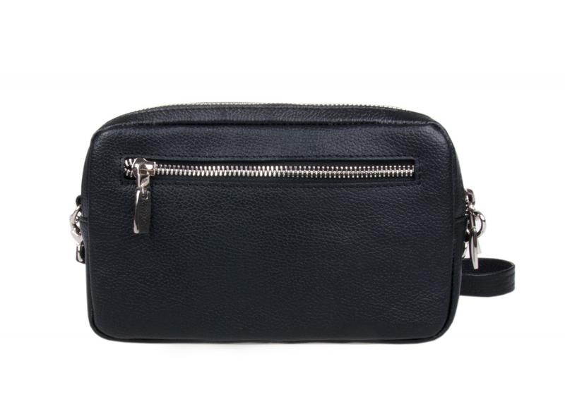 Закрывается на молнию. Два отделения, внутри по задней стенке потайной карман на молнии. Снаружи сзади прорезной карман на молнии. Петля на руку и регулируемый по длине плечевой ремень.