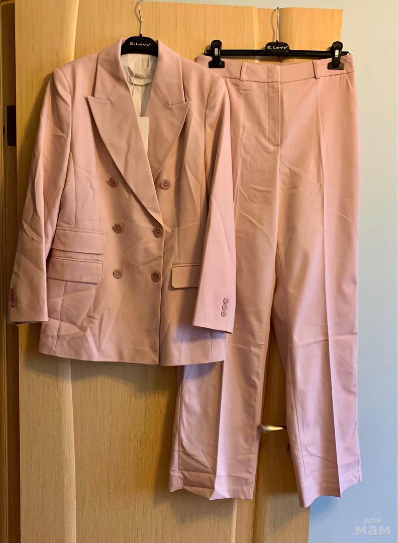 Пудровый костюм. Двубортный жакет и прямые брюки полная длина.