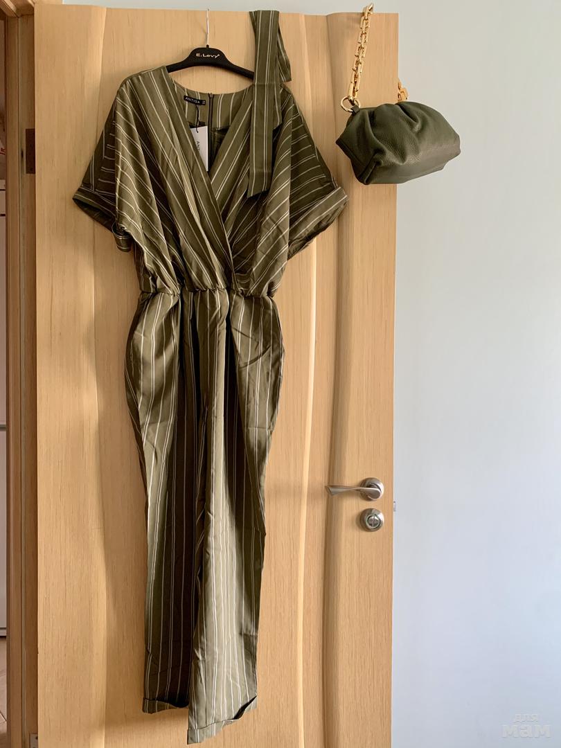 Красивый костюм в зеленую полоску, жакет прямой удлиненный, брюки заужены от колена