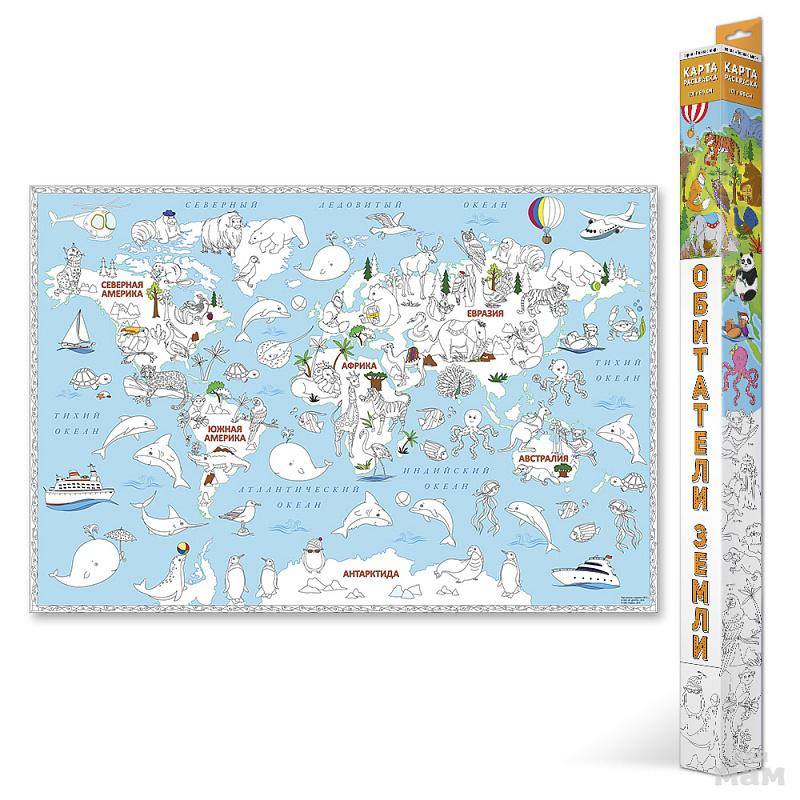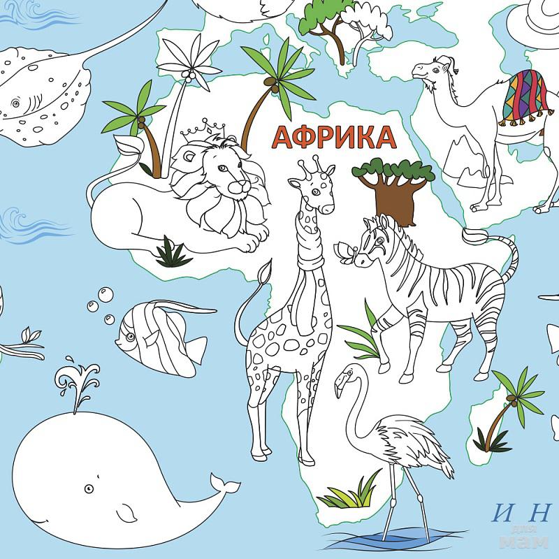 Обитатели животного мира Земли расселились по материкам и океанам нашей планеты на огромной карте. На каждом континенте ребенок сможет раскрасить самых интересных животных – медведей, слонов, кенгуру, моржей и многих других!