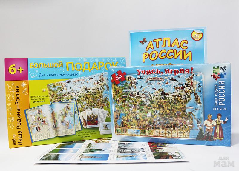 В атласе «Наша Родина-Россия» дан гимн России, описание герба, флага государства, карта с делением по федеральным округам. Из атласа дети узнают о народах, населяющих страну, и их национальных костюмах, о государственных религиях, основных достопримечательностях и их особенностях, полезных ископаемых, развитии промышленности и сельского хозяйства, о часовых зонах и государственных праздниках.