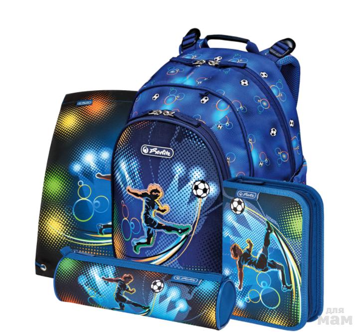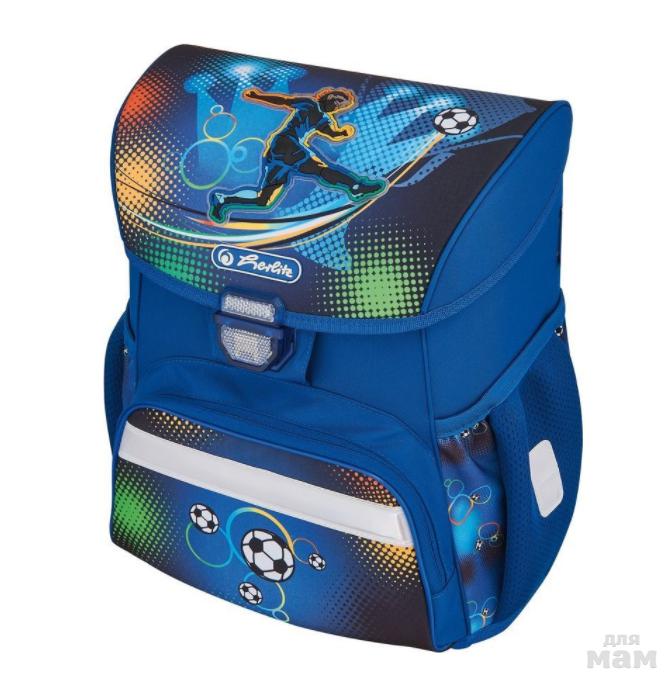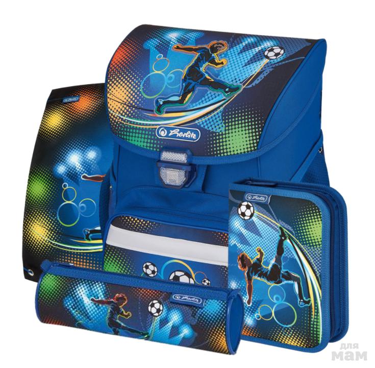 Синий ранец с футбольной тематикой радует своей легкость и компактностью. К нему прилагается сумка-мешок для сменной и спортивной обуви, пенал с 16 школьными принадлежностями и пенал побольше для хранения личных вещей. Имеет 2 внутренних отделения, в которых компактно размещаются книги, тетради, альбомы. Дополнительное пространство для хранения вещей предоставляет передний наружный карман на «молнии» и два боковых на резинке. Под крышкой имеется место для размещения расписания уроков.Ранец сделан из прочного, долговечного, влагоотталкивающего полиэстера. От загрязнения его защищает пластиковое дно. Loop Plus Soccer имеет эргономичную спинку и прочные, регулируемые лямки, благодаря чему носить его не тяжело. В целях безопасности ранец оснащен светоотражателями. Loop Plus Soccer небольших размеров, весит менее килограмма.