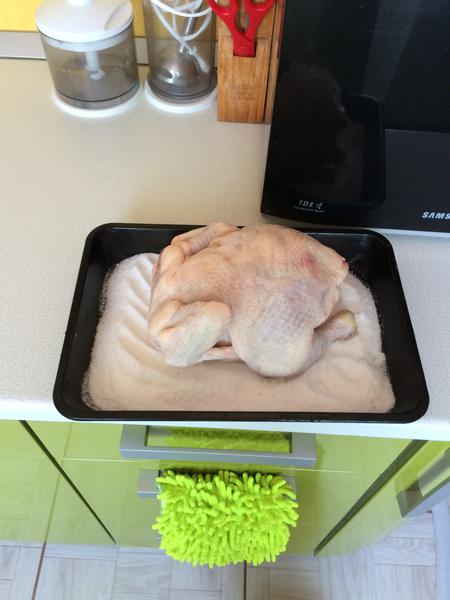 Размораживаем тушку полностью, я всегда ещё и мою не, на противень высыпаем пачку соли, я чуть меньше использую, т.к. противень небольшой), выкладываем курочку и в духовку примерно на час-полтора, пока не зарумяниваясь корочка. И вуаля....)))) все готово! Она сама вбирает соли столько сколько ей нужно.