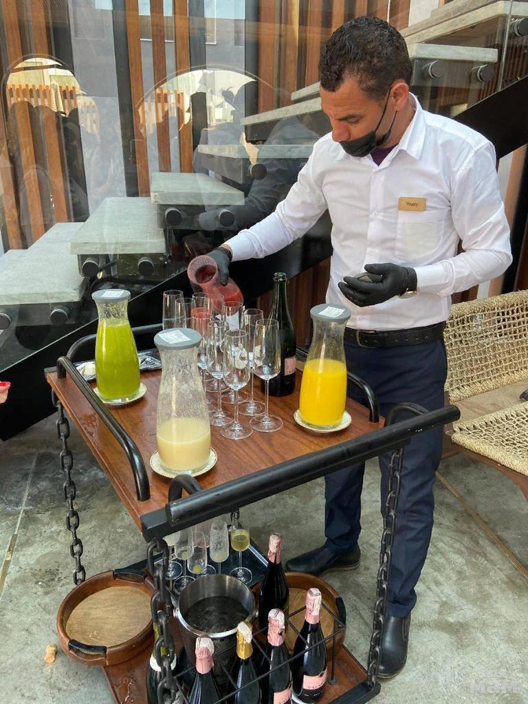 На пляже обслуживают официанты, подают напитки, мороженое, чипсы и фрукты. Подача в красивой посуде.
