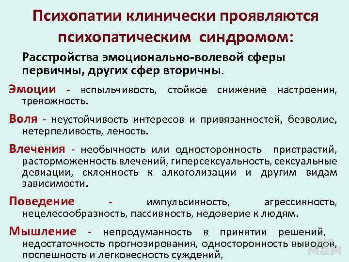 Психопатии клинически проявляются в патологических чертах характера, дисгармонии личности, нарушении эмоциональной и волевой деятельности, нарушении адаптации личности в обществе.