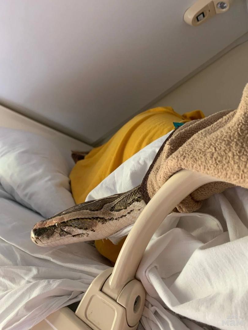 Хозяева наверное захотели отправить питона отдохнуть на море. Предположительно, питона засняли в поезде №35 «Северная пальмира» маршрутом Санкт-Петербург – Адлер.