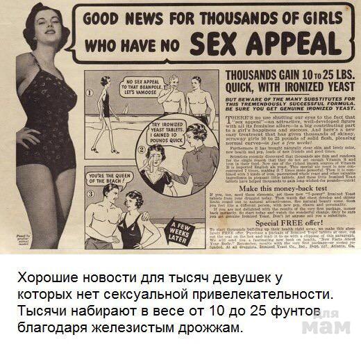 Сейчас в это трудно поверить, но в не таком уж далёком прошлом в США, например, худоба у женщин (да и у мужчин) считалась крайне непривлекательной. Более того, худых людей было много, настолько много, что в те времена существовали и пользовались спросом средства для ускоренного набора лишних пару килограмм. Считалось, что таким образом (худая) женщина могла стать привлекательной в глазах мужчин. Ниже - подборка рекламных объявлений таких средств.