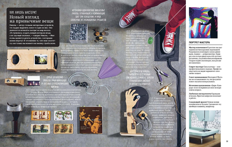 Книга "Искусство мастерить" - для тех, кто идет по пути познания окружающего мира через творчество и научные эксперименты. В ней представлены портреты 23 мастеров-любителей, в разное время работавших в Творческой мастерской музея "Эксплораториум". Герои книги рассказывают о своих любимых приемах, инструментах и материалах, источниках вдохновения, поисках и сомнениях. Словом, обо всем, что помогает им воплощать в жизнь свои оригинальные идеи.