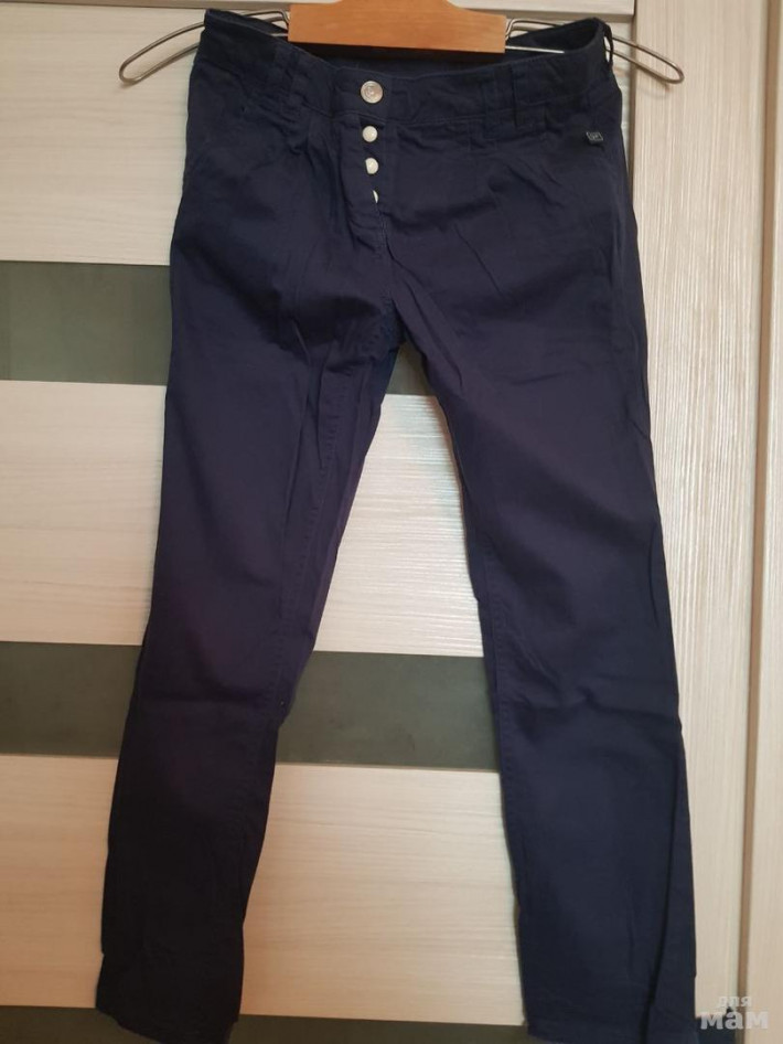 Брючки синие quadra frogio 146, синие на кнопочках. Тоже маломерят, можно со 134 носить до 140 комфортно. Носили в школу. 600 руб.