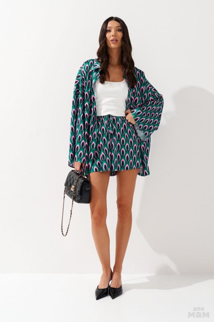 Комплект состоит из рубашки и шорт выполнен из ткани с ярким абстракным принтом.