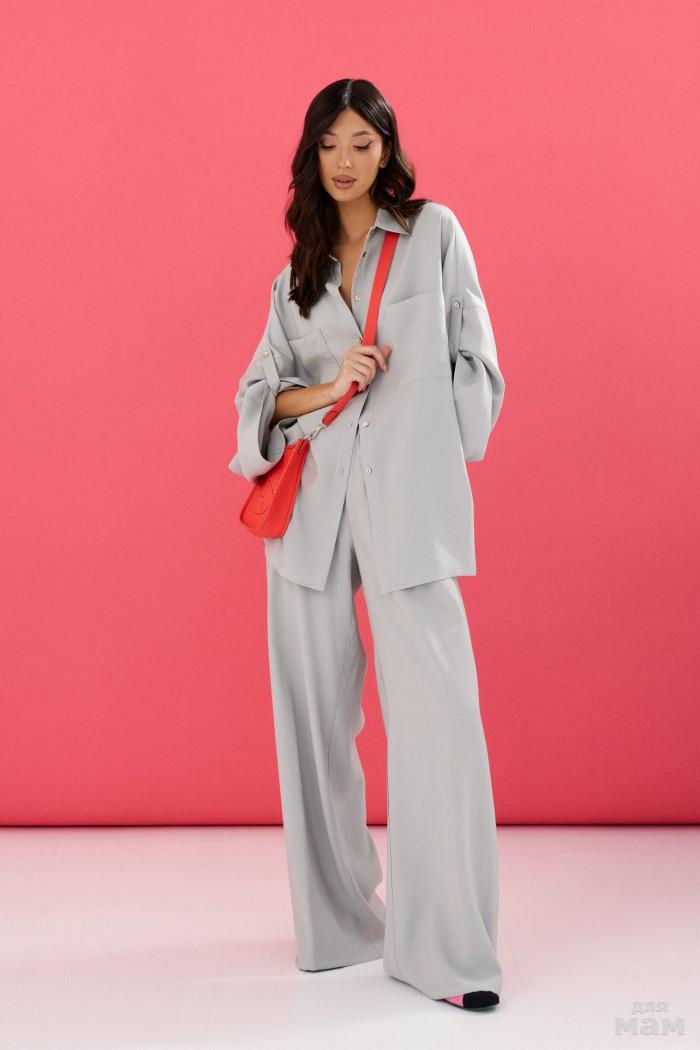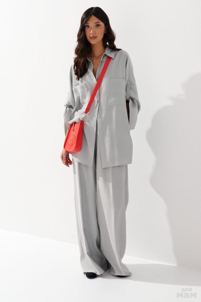 Комплект состоит из рубашки и брюк выполнен из ткани светло-серого цвета.