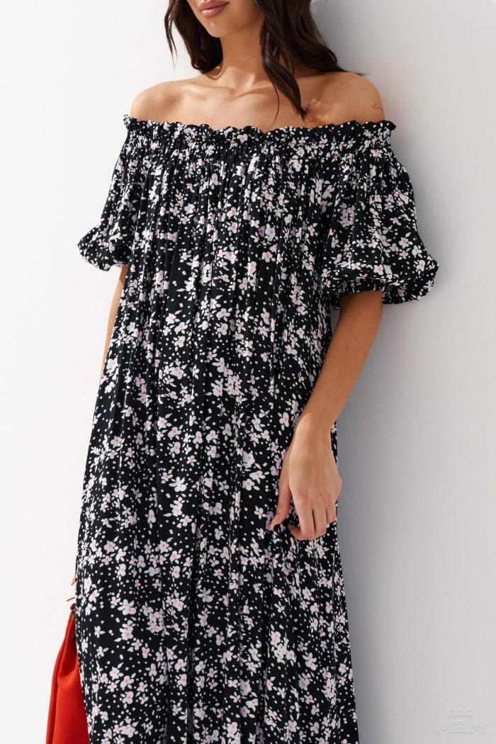 Летнее платье с полуоткрытыми плечами выполнено из черного полотна с контрастным цветочном принтом.