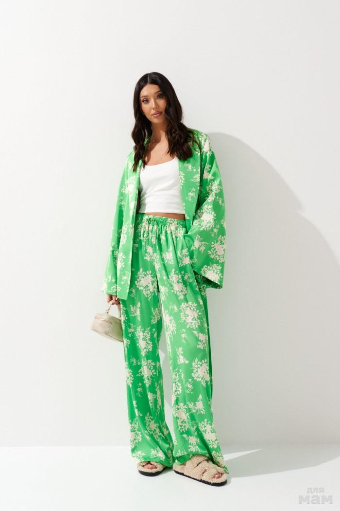 Комплект состоит из туники и брюк выполнен из яркого зеленого полотна с цветочным принтом.