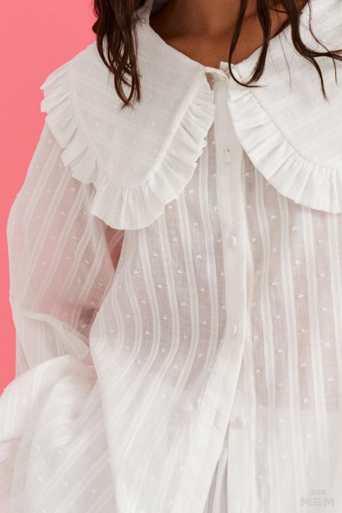 Рубашка прямого кроя с крупным акцентным воротником выполнена из фактурного полотна белого цвета.