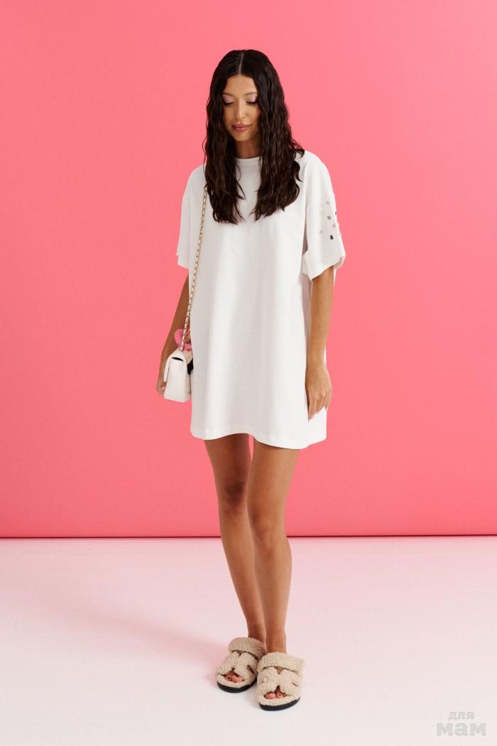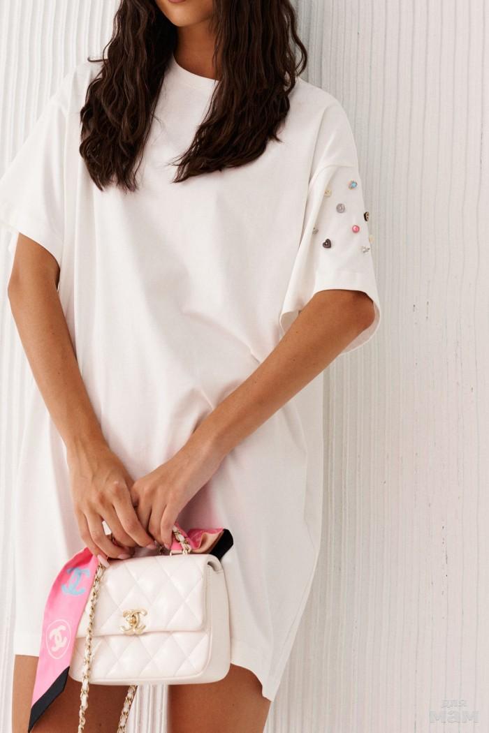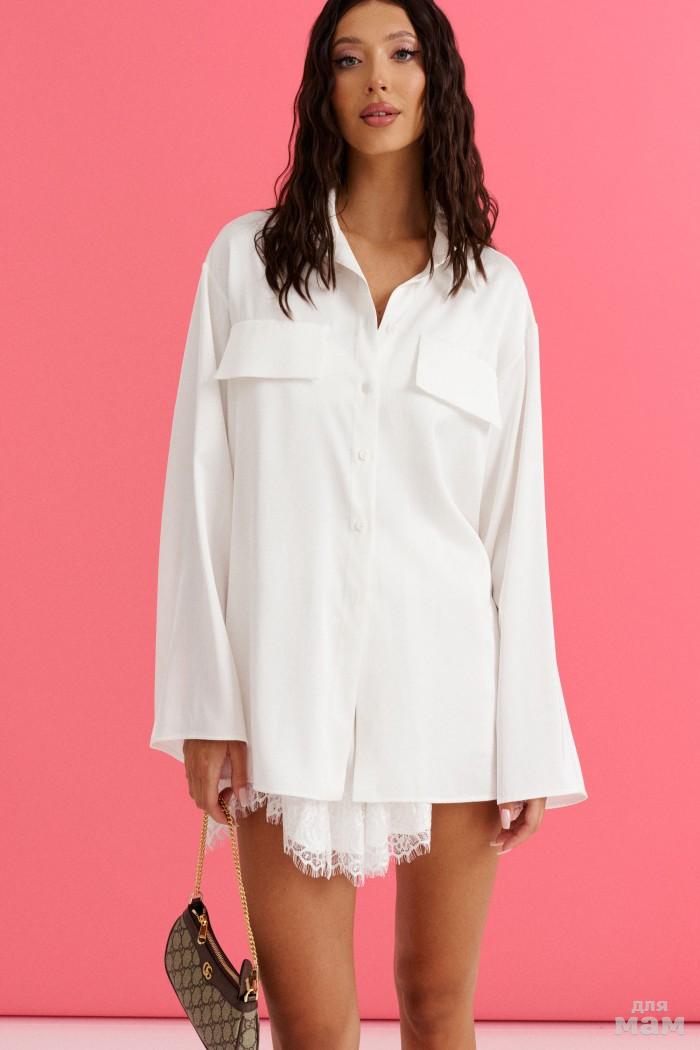 Рубашка прямого свободного кроя выполнена из белого струящегося полотна.