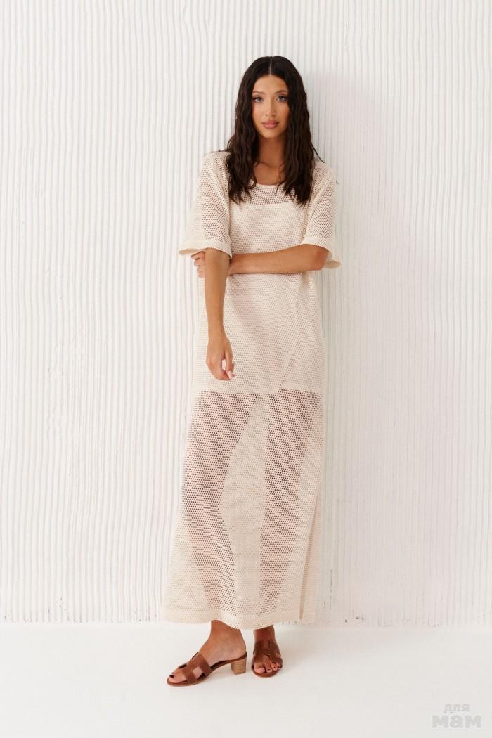 Рубашка прямого кроя выполнена из полупрозрачного полотна ажурной вязки.