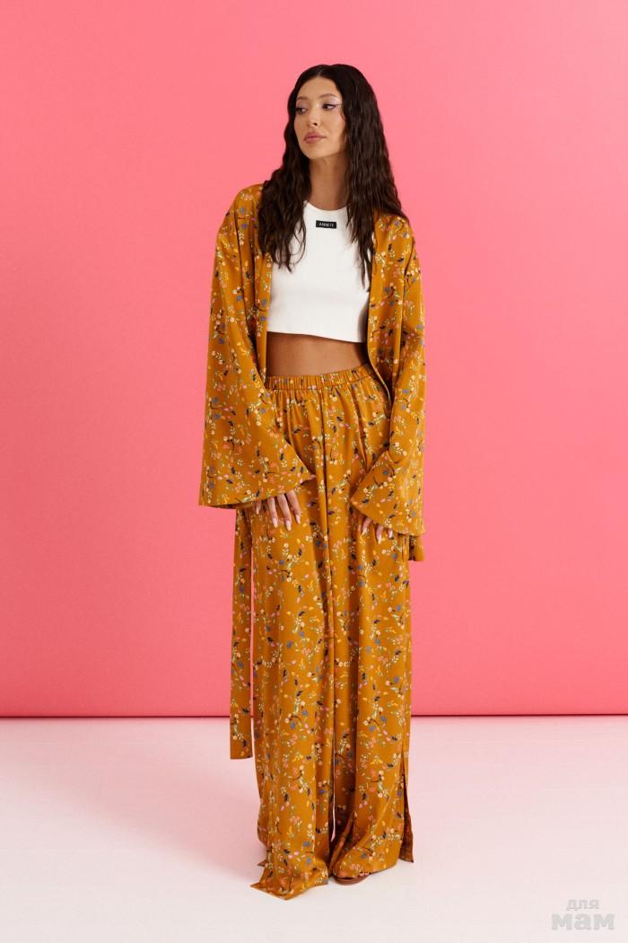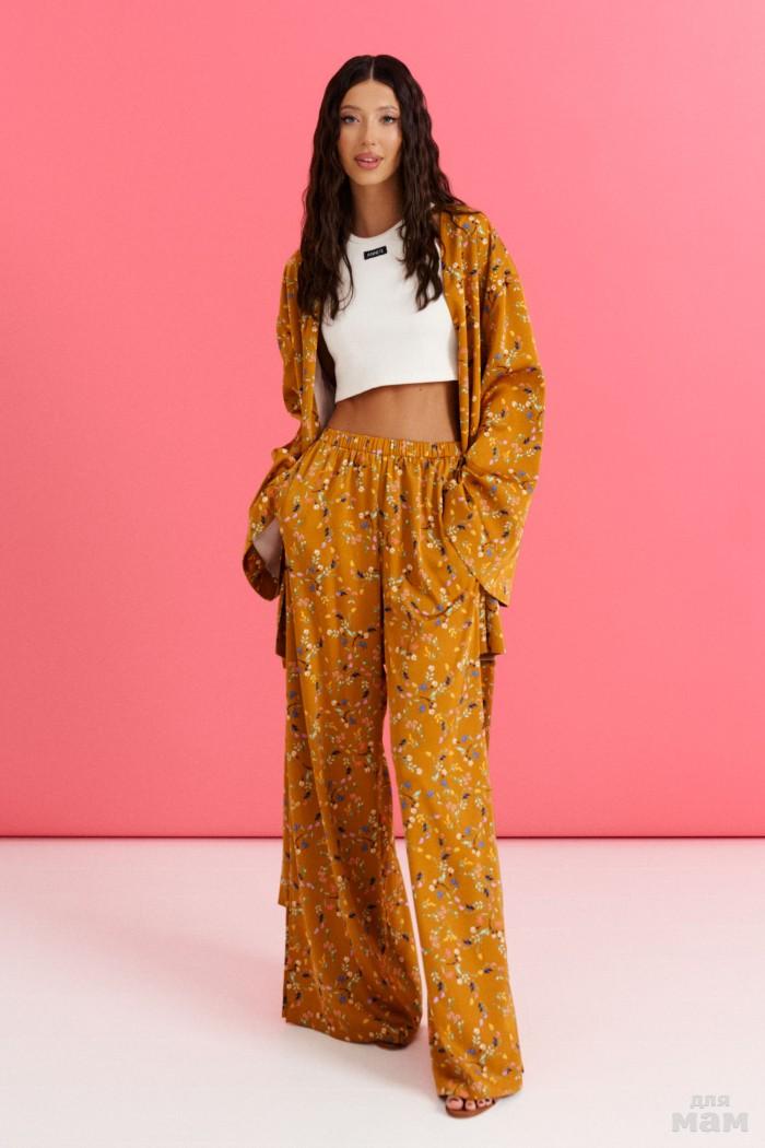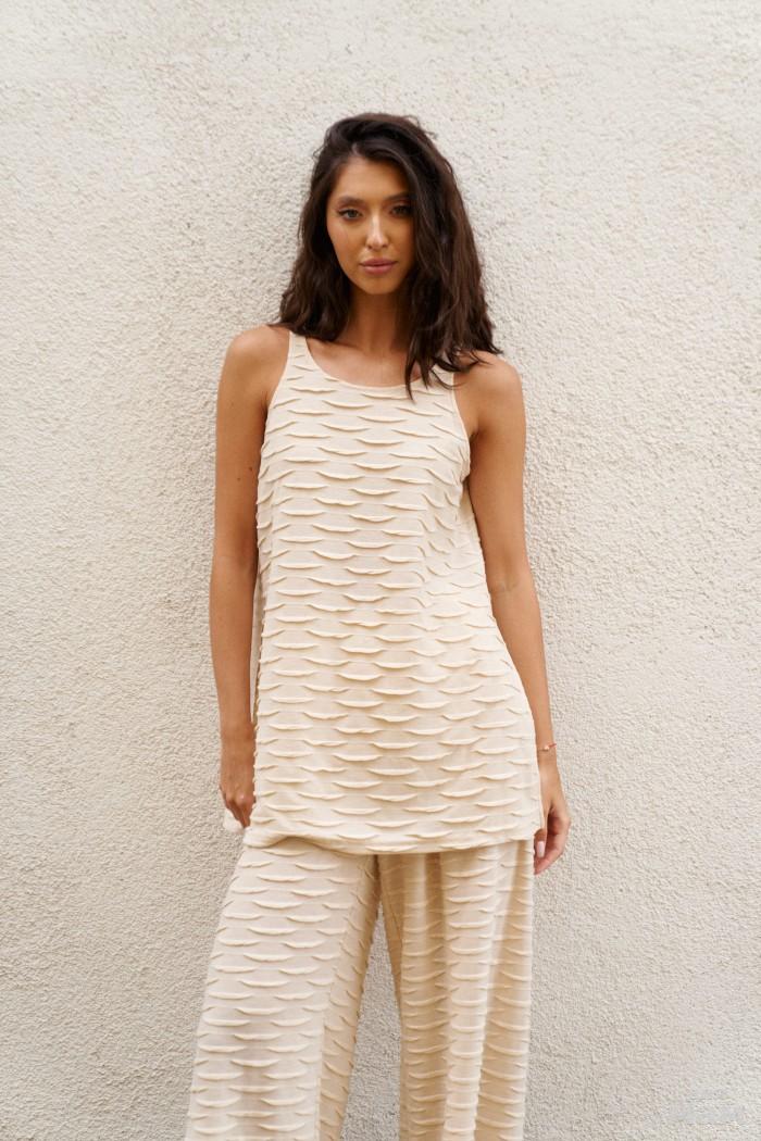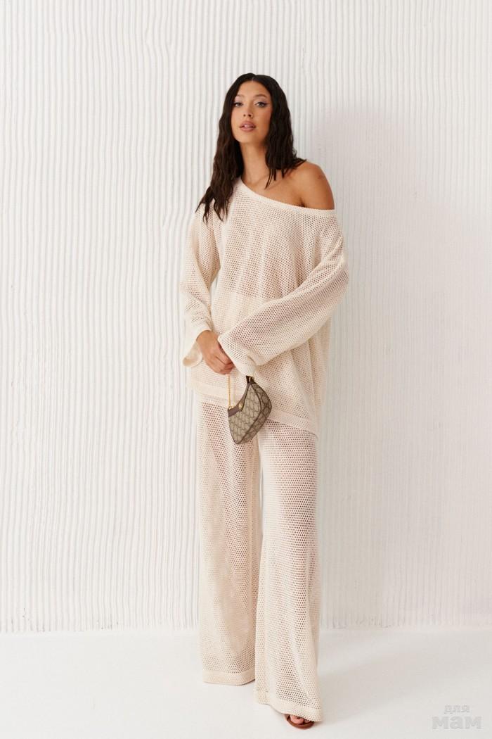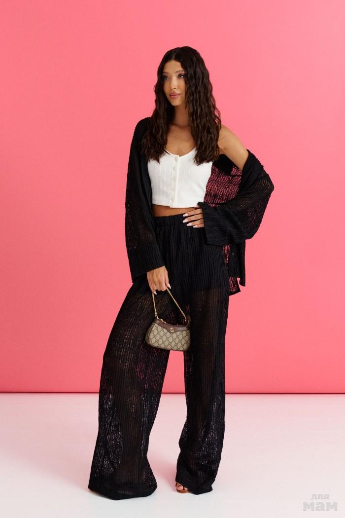 Комплект состоит из джепера и брюк выполнен из полупрозрачной ткани.