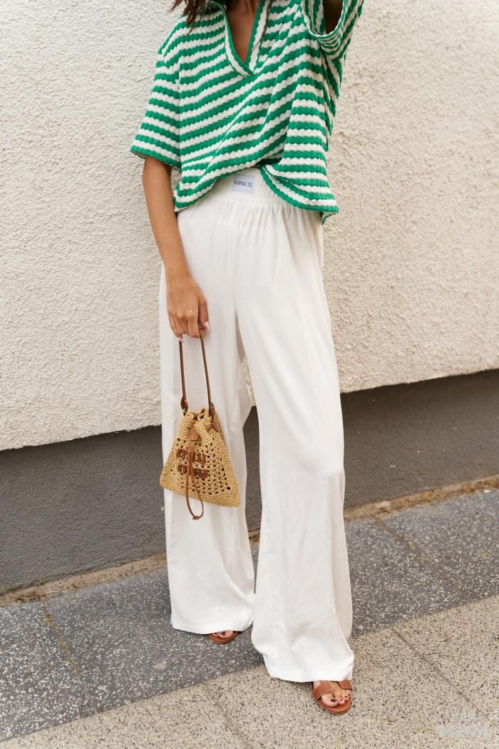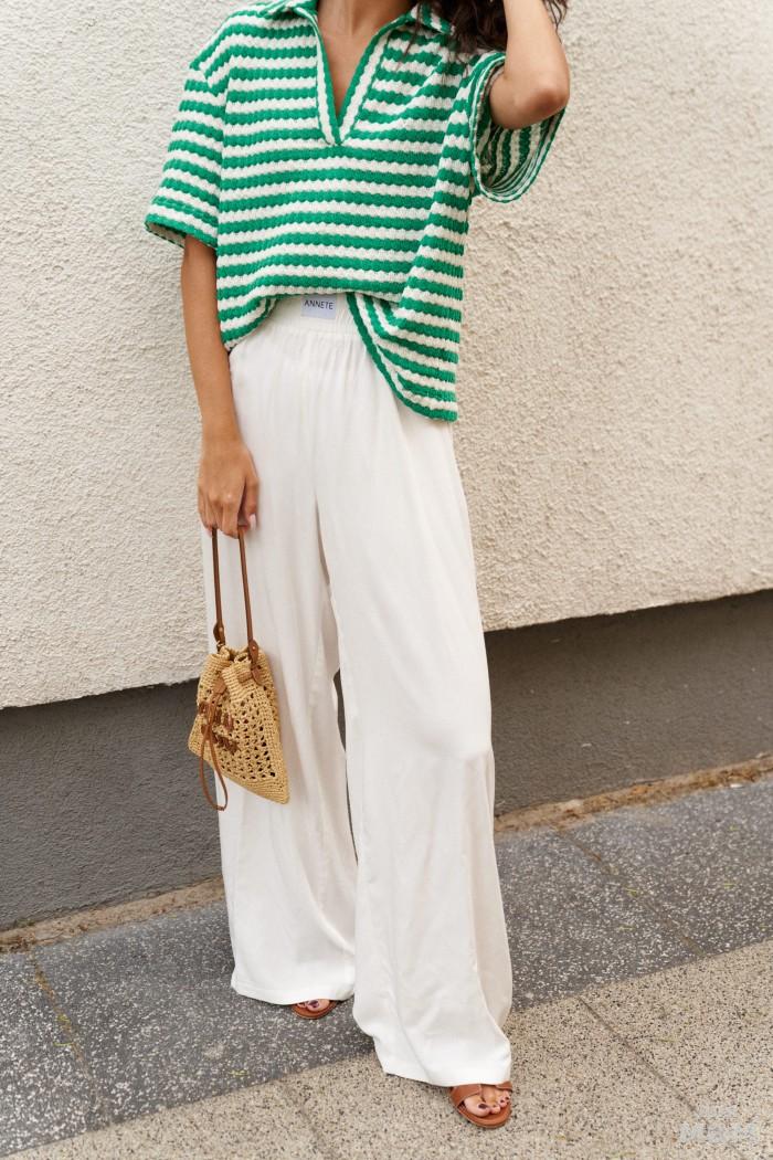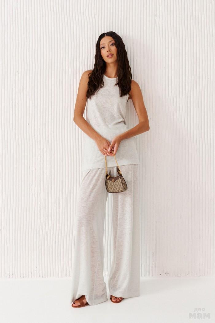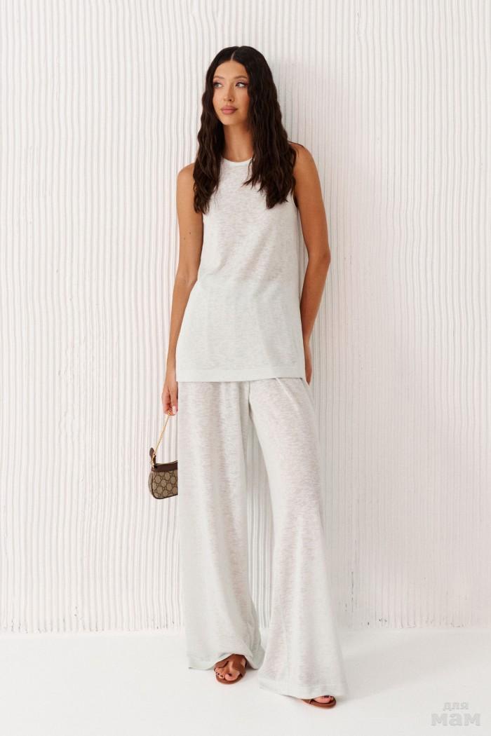Брюки прямого свободного кроя выполнены из белой струящейся ткани.