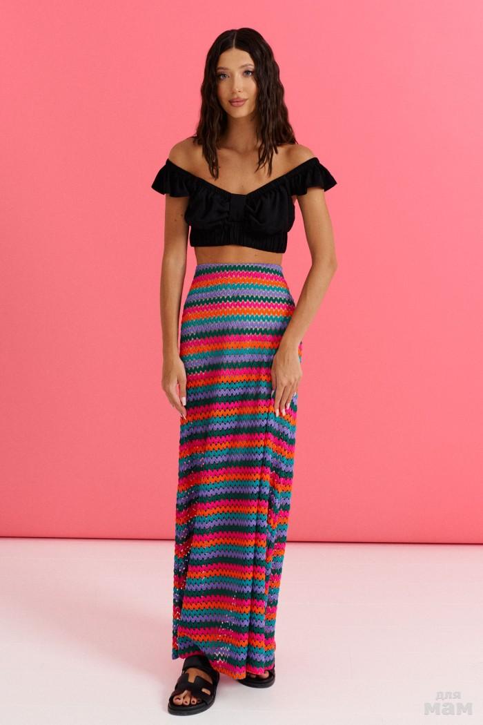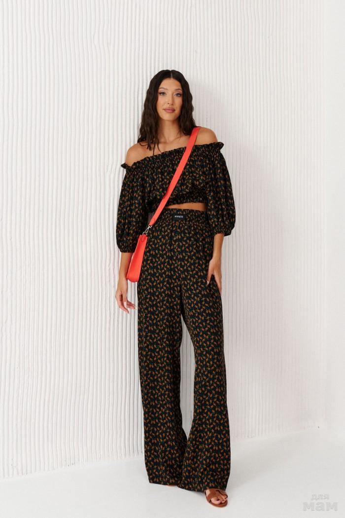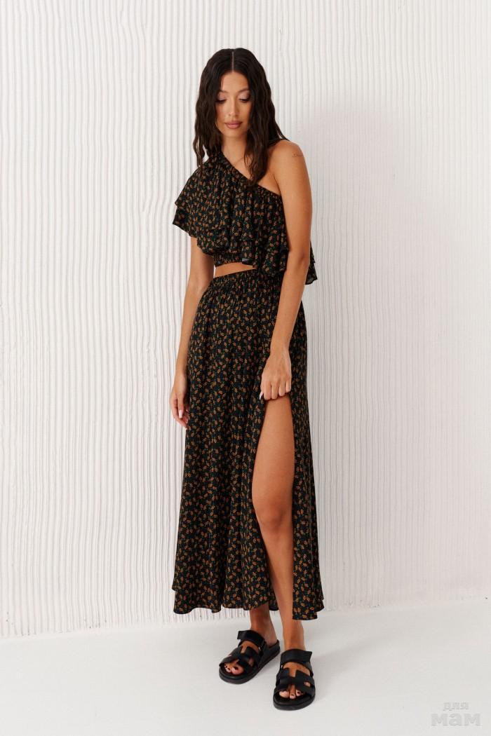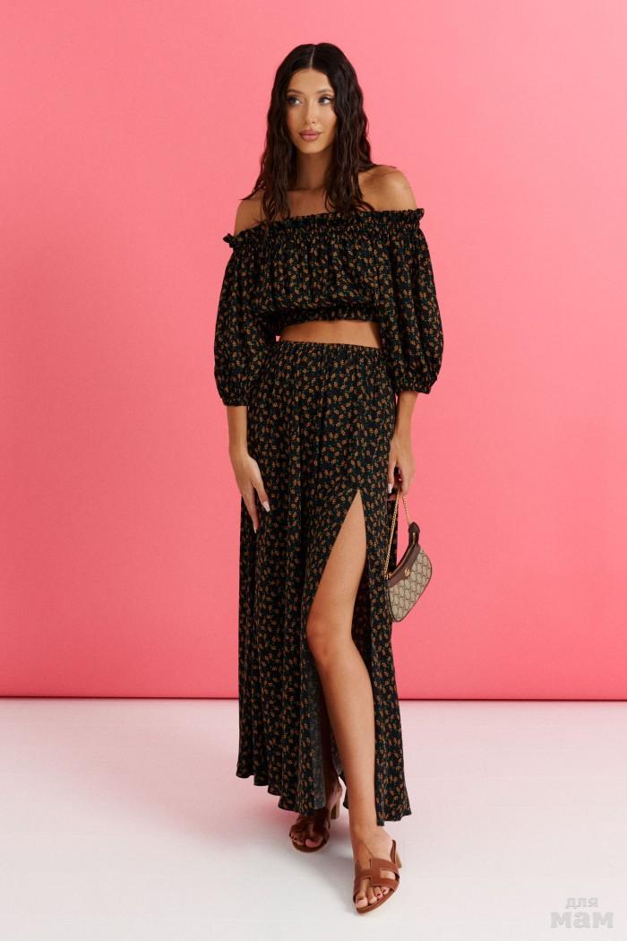 Комплект состоит из топа и юбки выполнен из струящегося полотна с принтом мелкая россыпь.