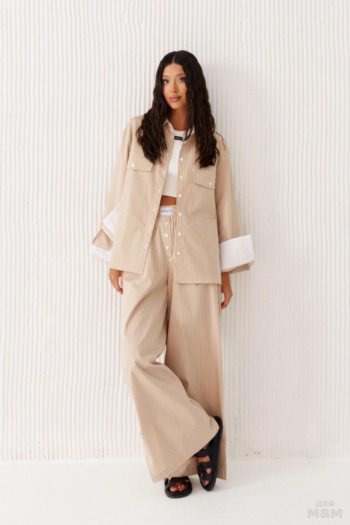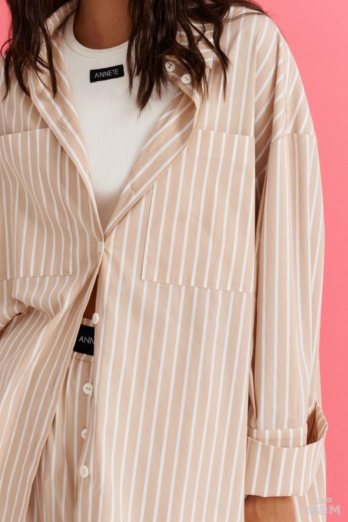 Рубашка прямого кроя выполнена из ткани цвета капучино с принтом белая вертикальная полоска.