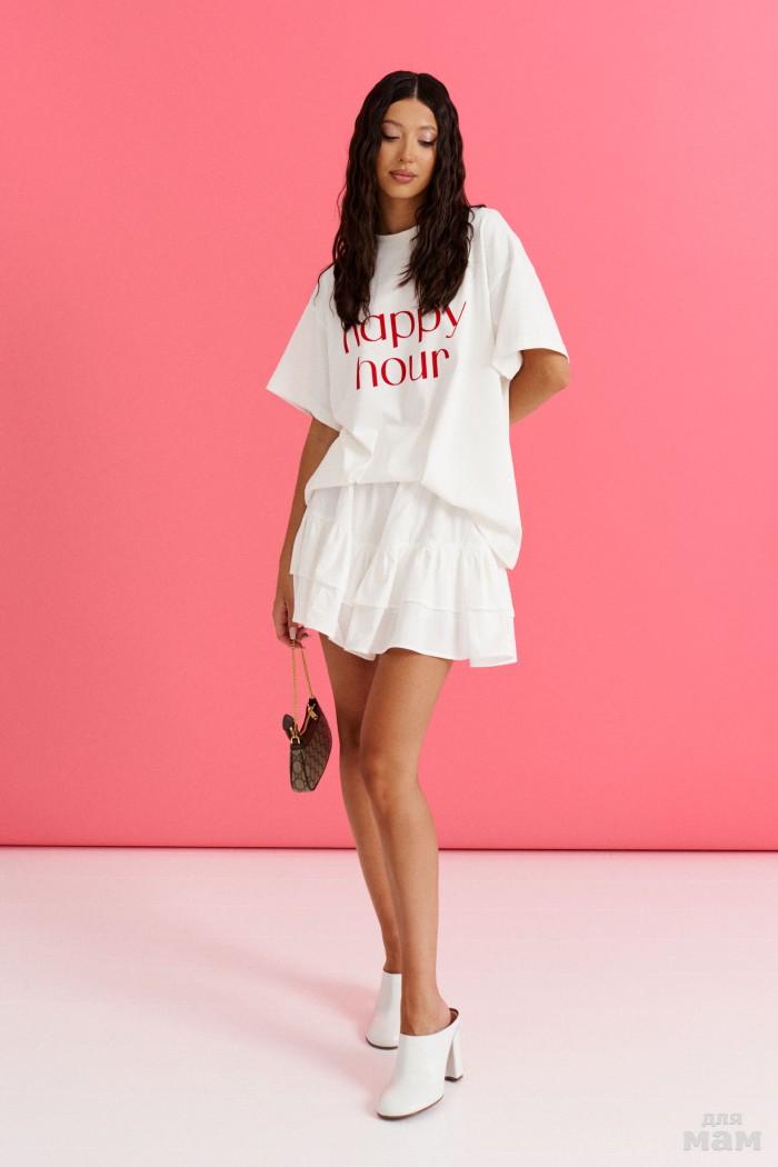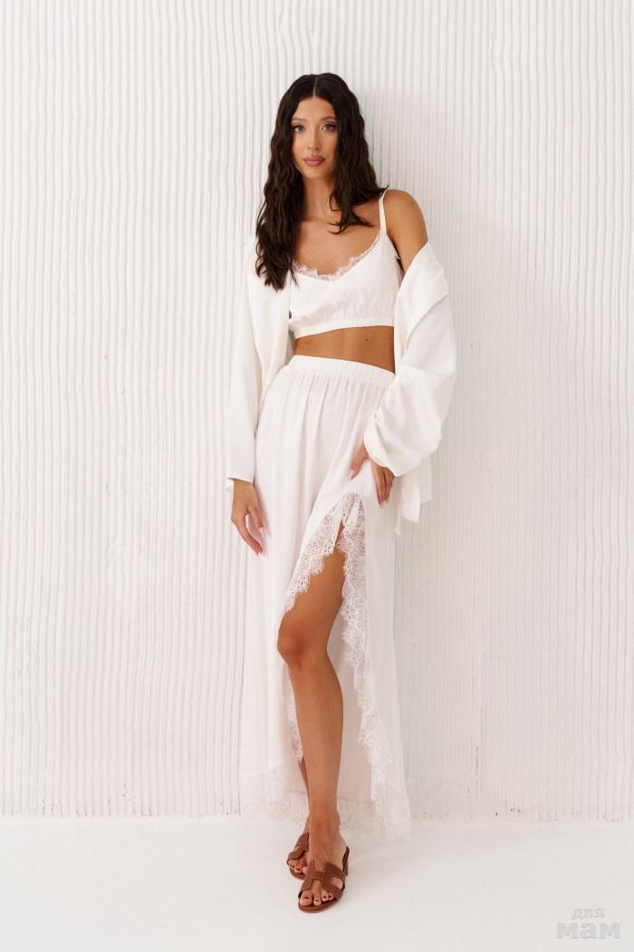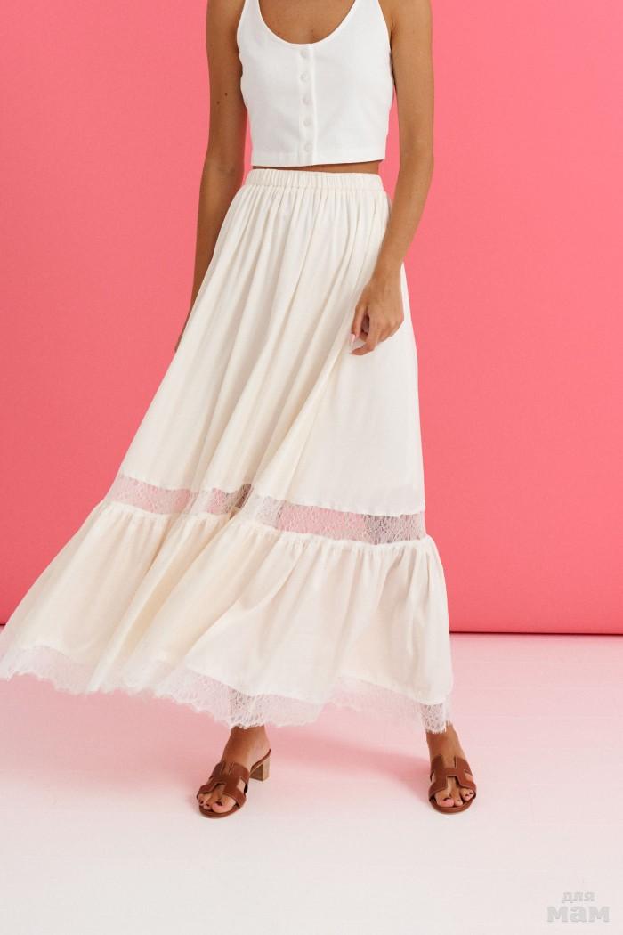 Юбка свободного кроя с акцентным кружевом выполнена из белого струящегося полотна.