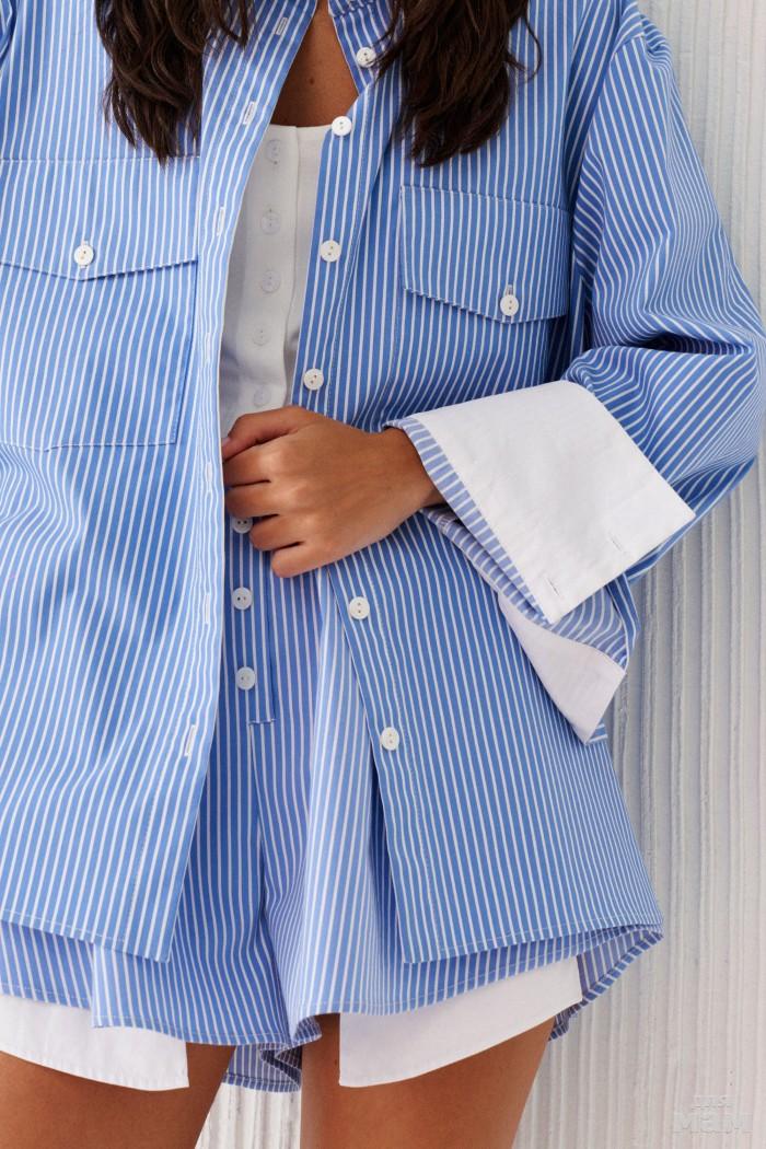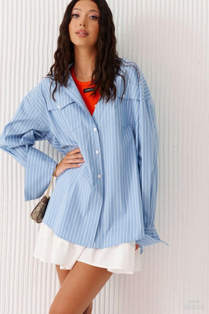 Рубашка прямого кроя выполнена из ткани голубого цвета с принтом белая вертикальная полоска.