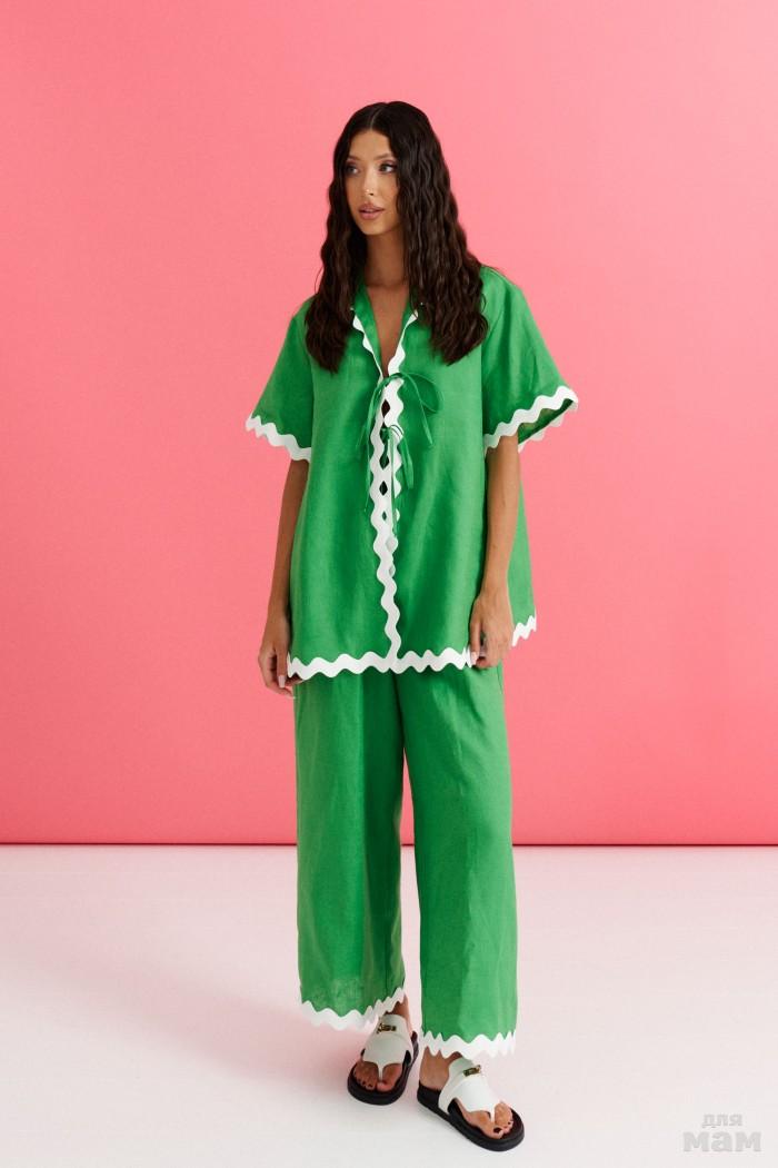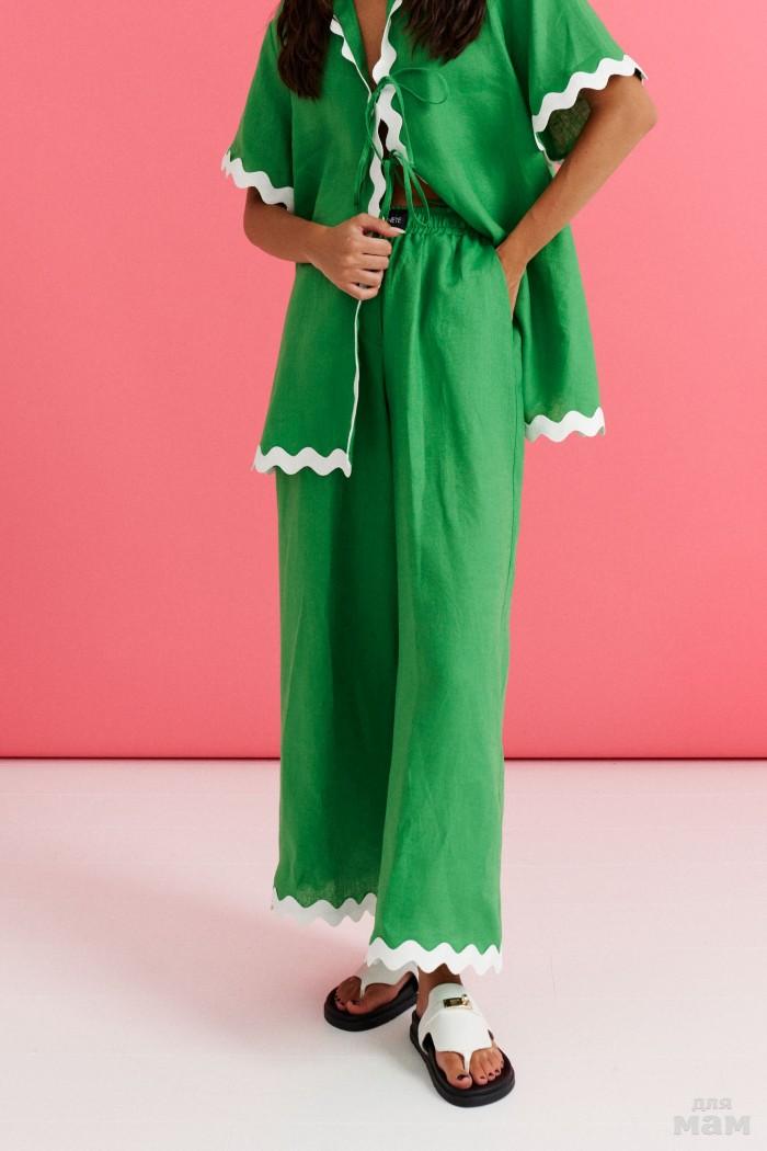 Характеристики: прямой крой, пояс на резинке, по переду имитация ширинки декорирована пуговичками, в боковых швах карманы. Длина 96 см