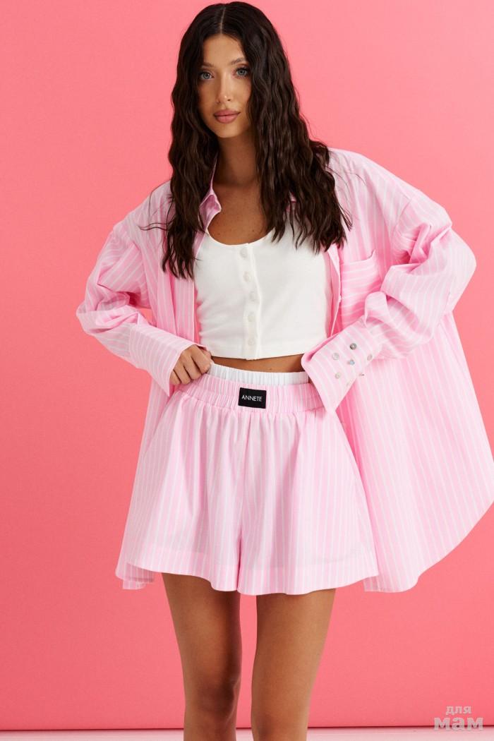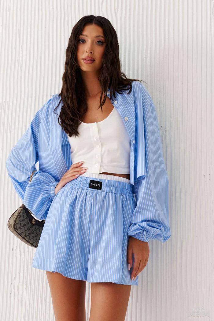 Шорты свободного кроя с акцентными карманами выполнены из ткани голубого цвета с принтом вертикальная белая полоска. Характеристики: свободный крой, пояс на резинке, на резинке брендированная нашивка, по переду декоративные пуговички, в боковых швах карманы. Длина 33 см.