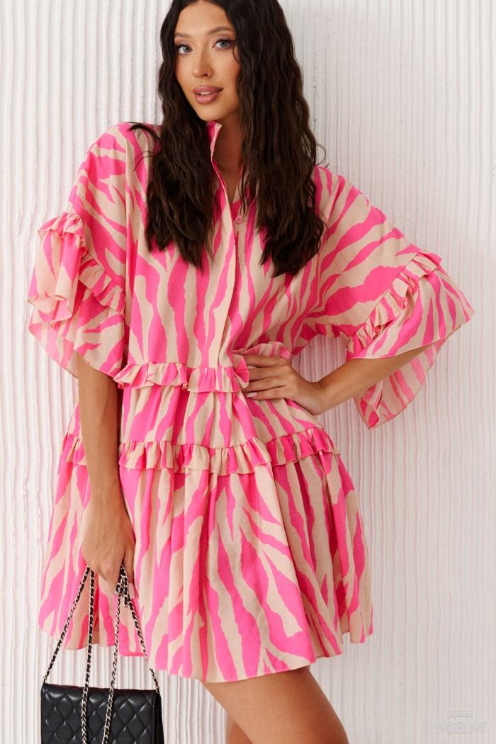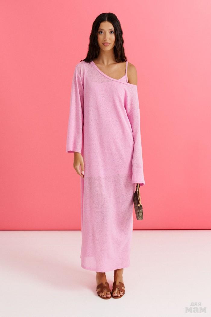 Платье на бретелях выполнено из розовой ткани с принтом серые сердца.