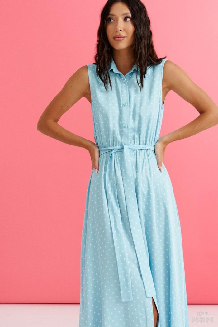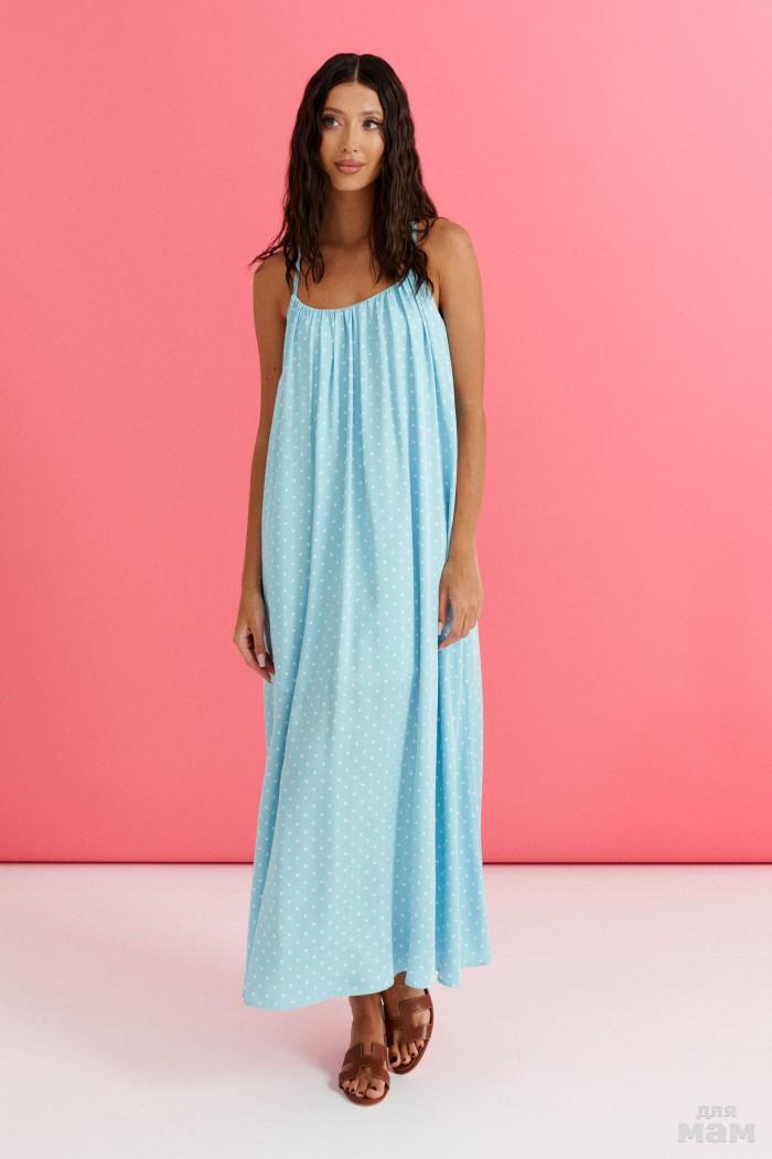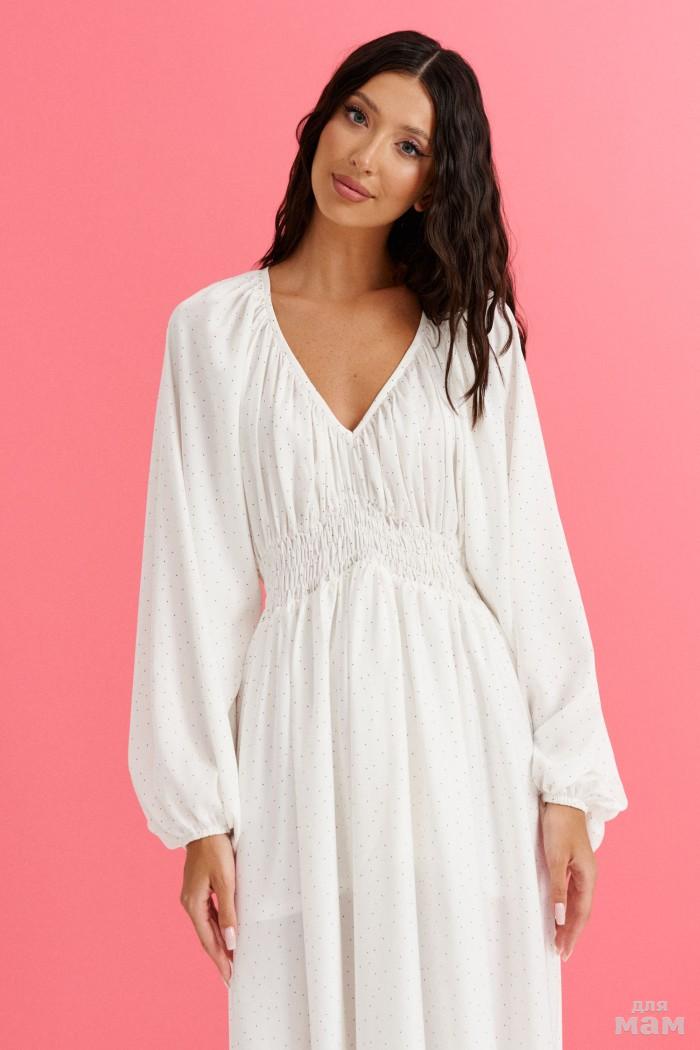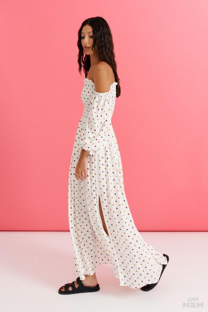 Платье с открытыми плечами выполнено из белого полотна с принтом горох.