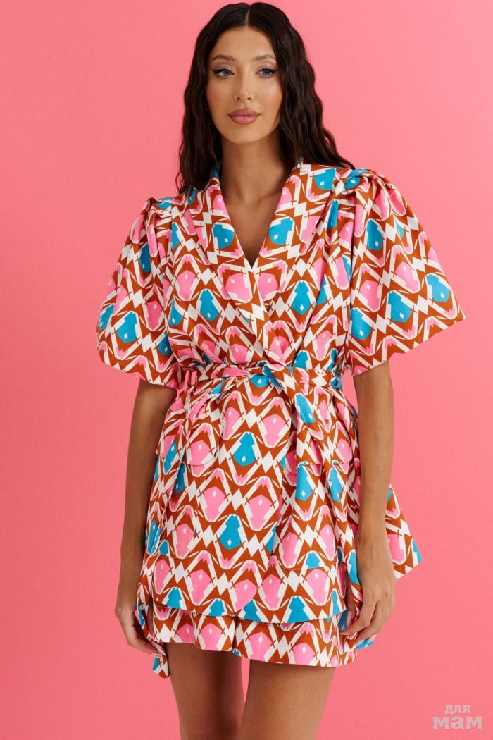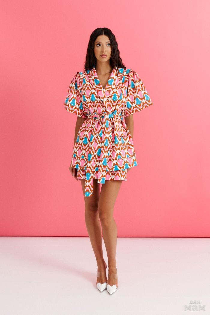 Комплект состоит из рубашка и шорт выполнен из белого полотна с контрастным абстрактным принтом.