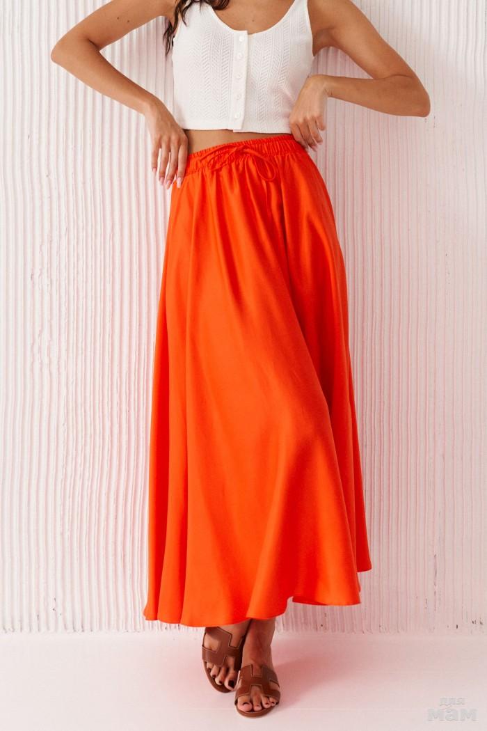 Юбка свободного кроя выполнена из ткани насыщенного оранжевого цвета.