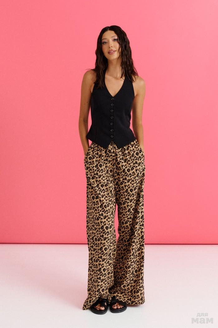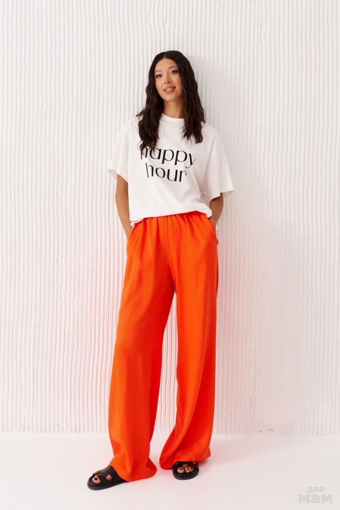 Брюки прямого кроя, короткая подкладка, пояс на резинке. Длина брюк 111 см.