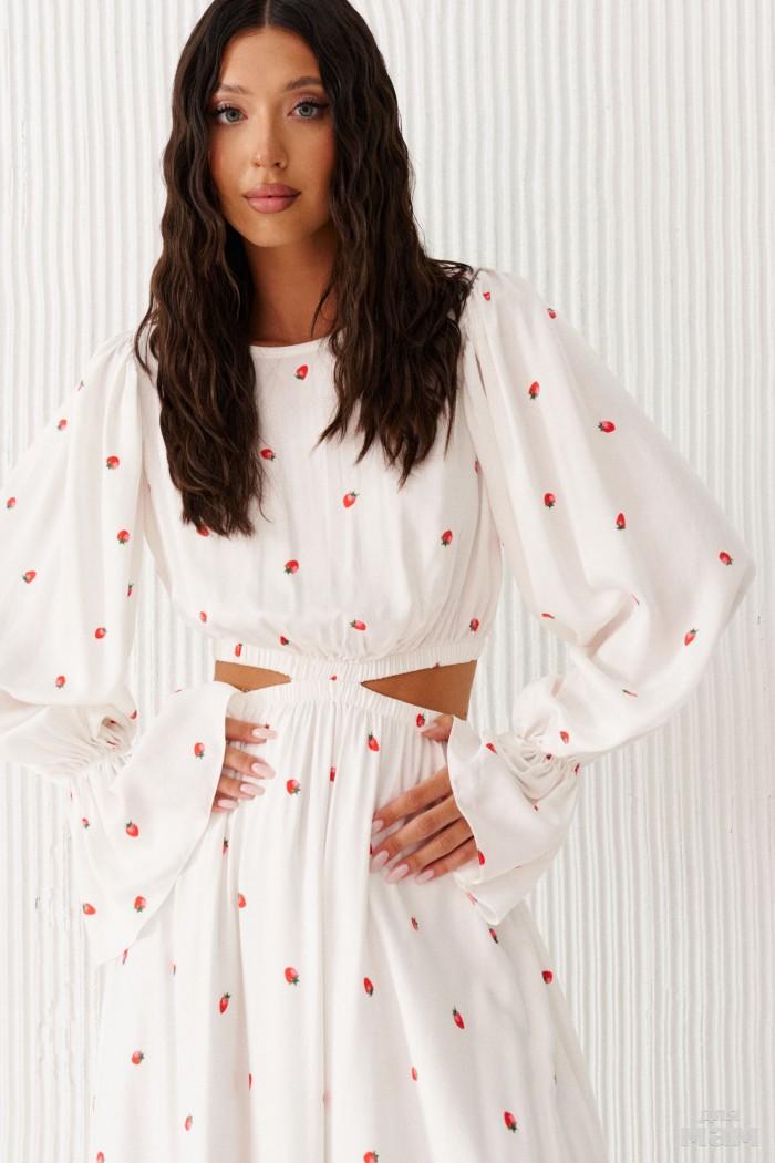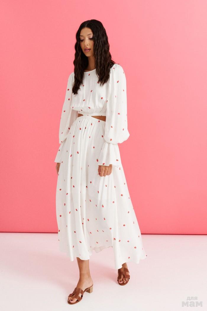 Платье полуприлегающего силуэта выполнено из белого полотна с ягодным принтом.