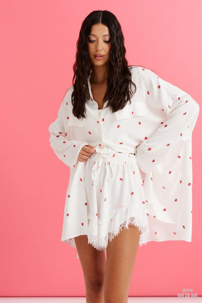 Шорты свободного кроя выполнены из ткани белого цвета с ягодным принтом. Характеристики: свободный крой, пояс на резинке с кулиской, по низу шорты украшены ажурным кружевом. Длина шорт 35 см.