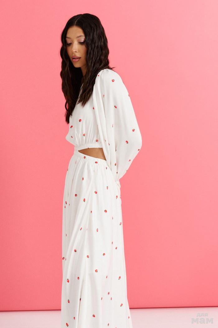 Юбка полуприлегающего силуэта выполнена из белой ткани с ягодным принтом.