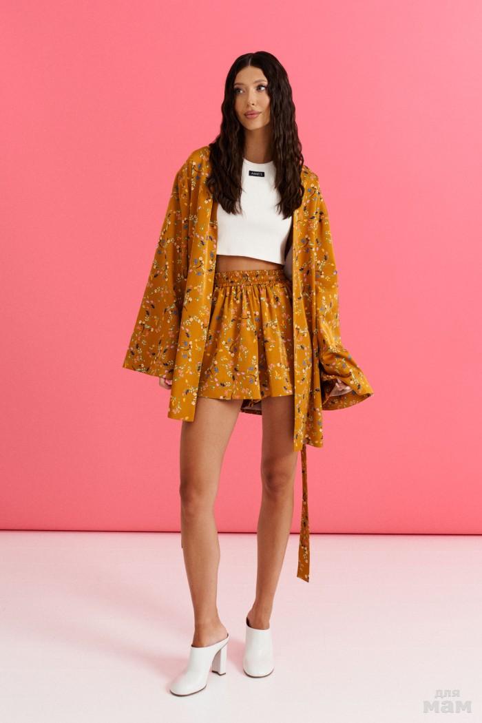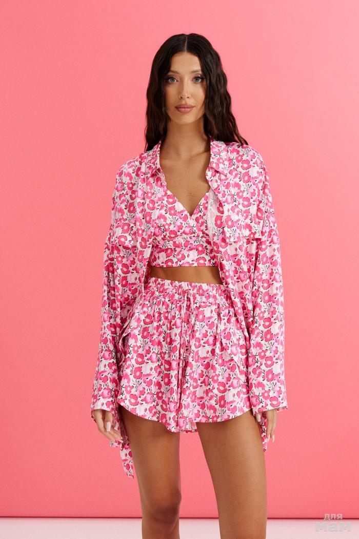 Комплект состоит из топа, рубашки и шорт выполнен из ткани с цветочным принтом.