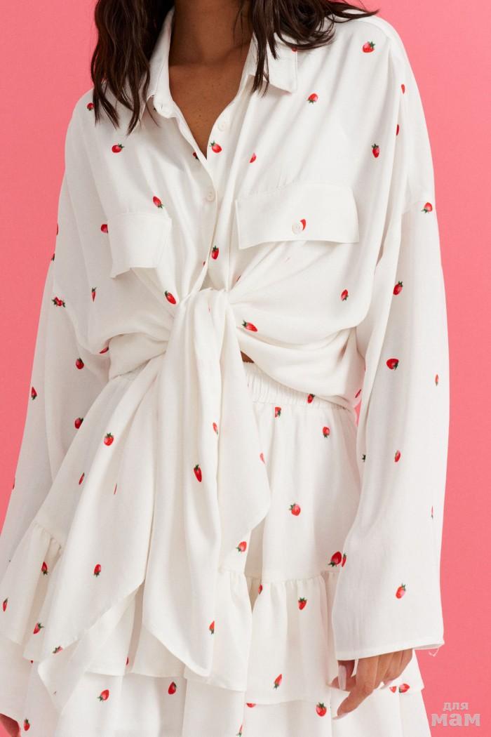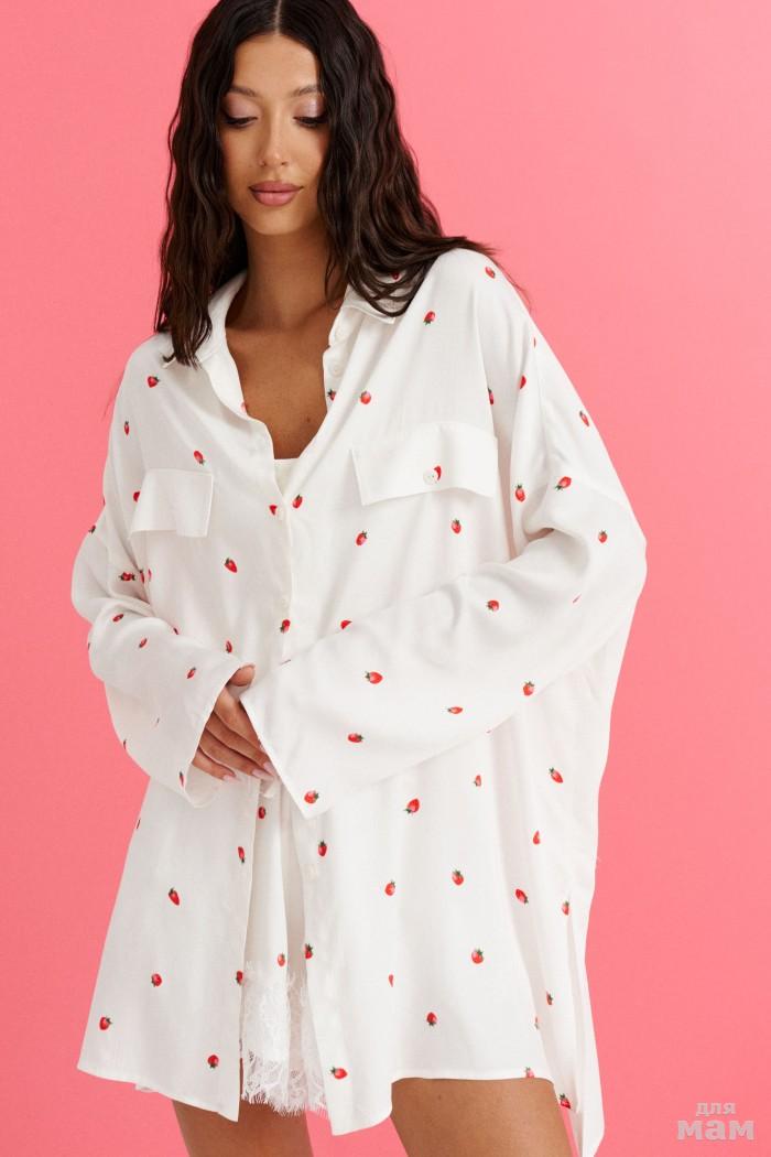 Рубашка прямого свободного кроя выполнена из белой ткани с ягодным принтом.