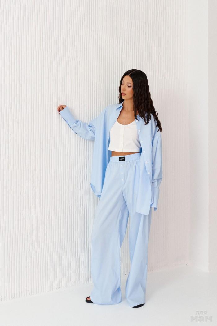 Рубашка прямого свободного кроя выполнена из голубого хлопкового полотна.