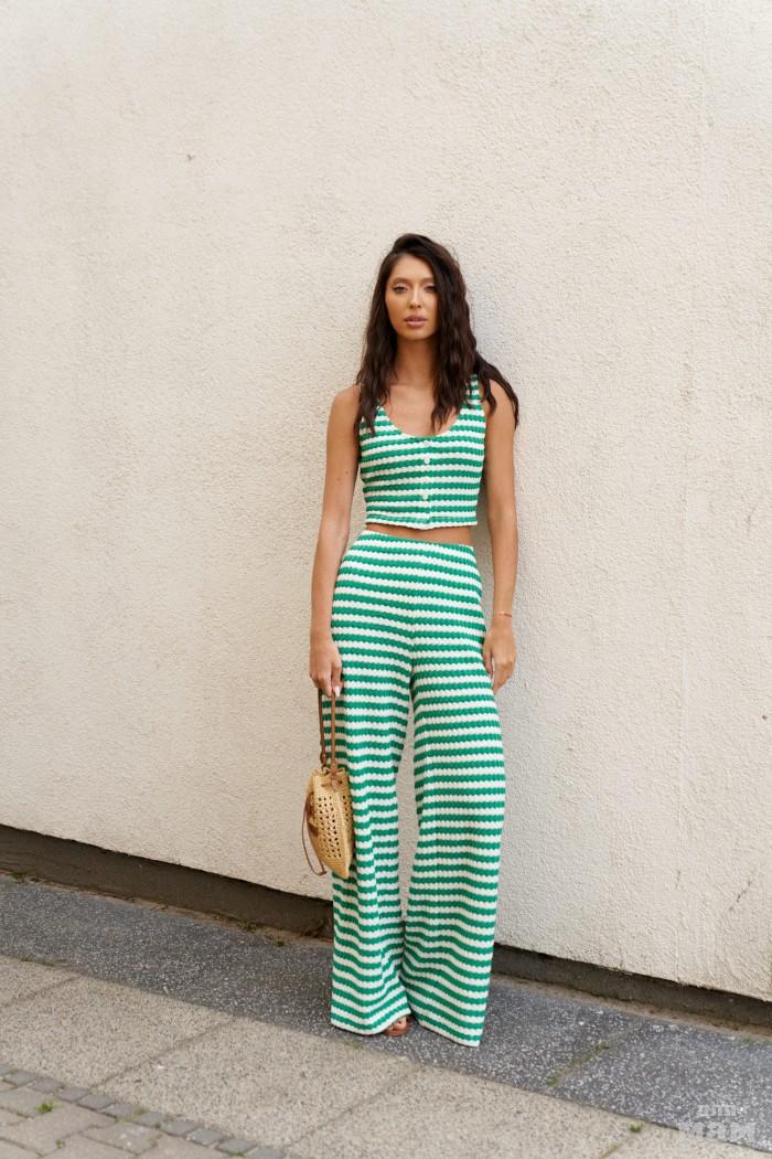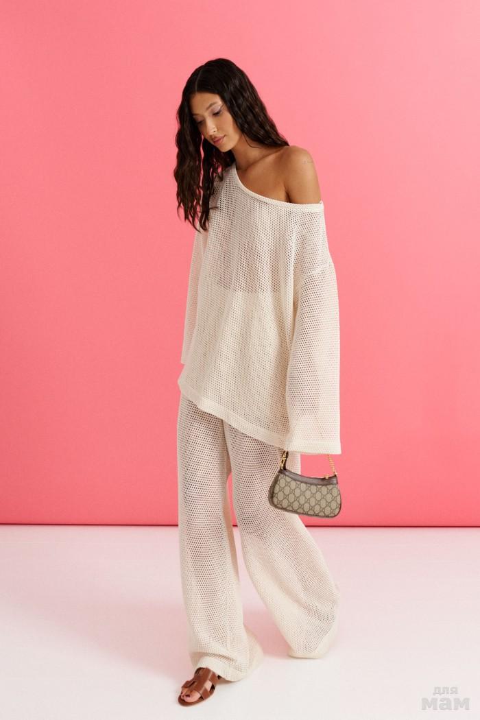 Брюки прямого кроя выполнены из полупрозрачного полотна ажурной вязки.