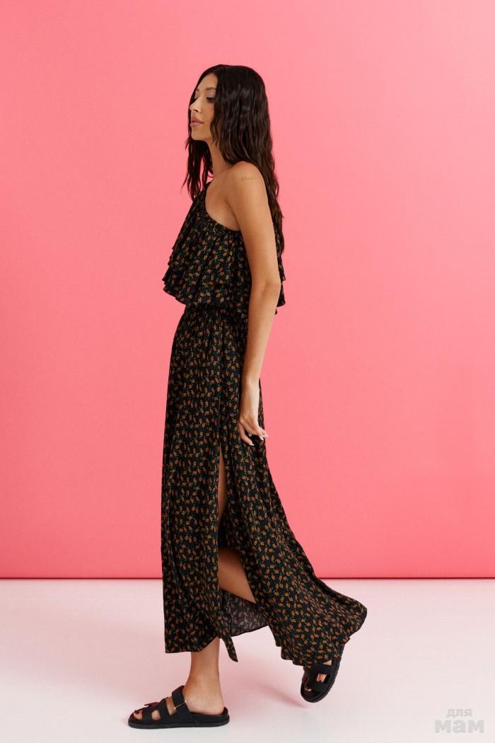 Сарафан на бретелях выполнен из белого полотна с принтом мелкая россыпь с акцентным разрезом.