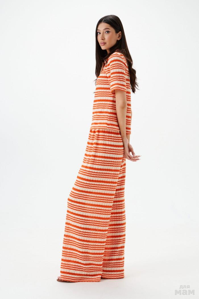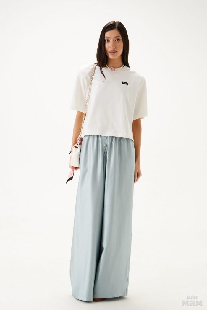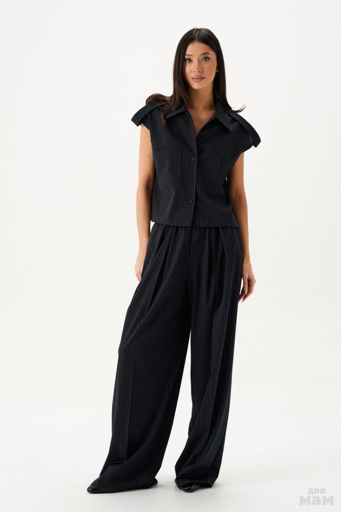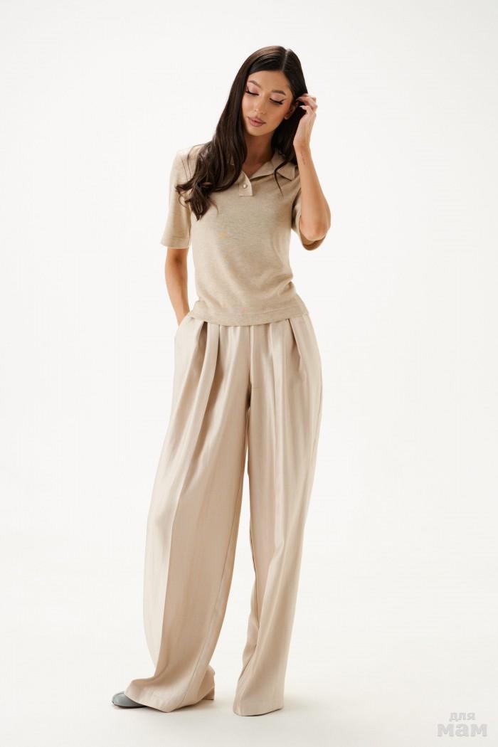 Брюки свободного кроя. Выполнены из текстильного полотна. В боковых швах карманы с отрезным бочком. Пояс стабильный, застежка на петлю, пуговицу. По переду заутюженные стрелки. Длина 114 см