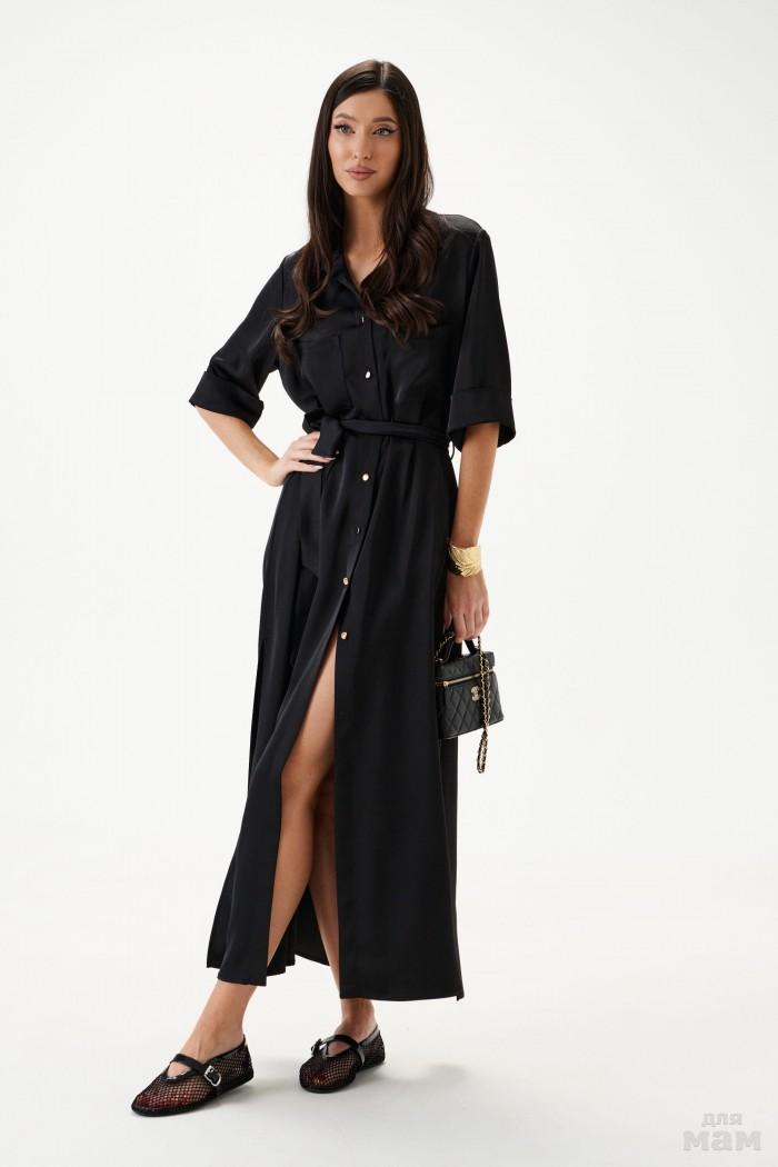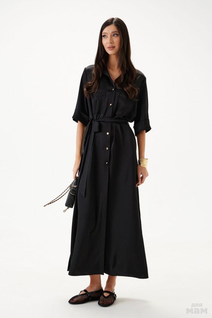 Платье-макси. Выполнено из трикотажного полотна. Прямой крой. Воротник-поло, отложной. Застёжка – пуговички. Рукав втачной. Длина рукава от линии втачивания 22 см. Длина спинки 137 см