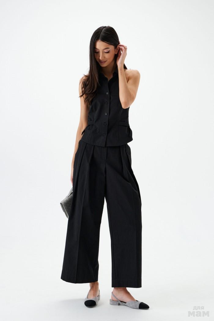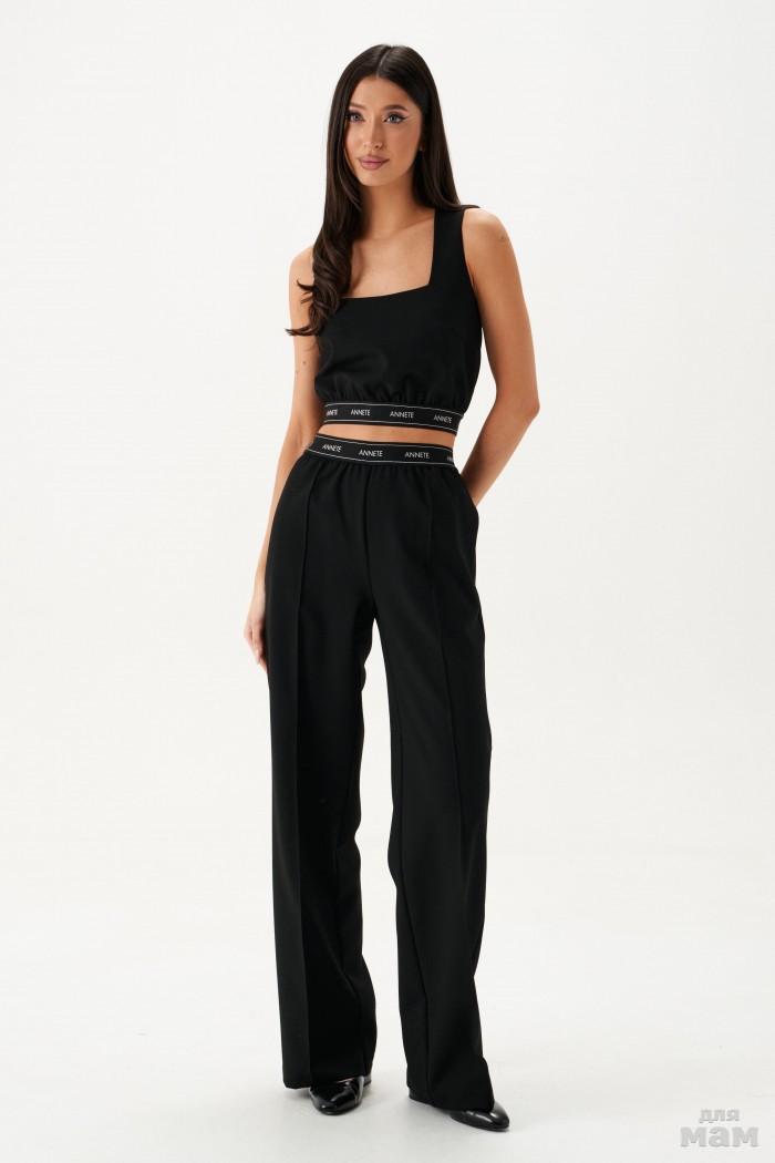 Брюки прямого кроя. Выполнены из костюмной ткани чёрного цвета. Пояс на брендированной резинке. Застёжки нет. По передней и задней частям застроченные стрелки. В боковых швах карманы. Длина 108 см