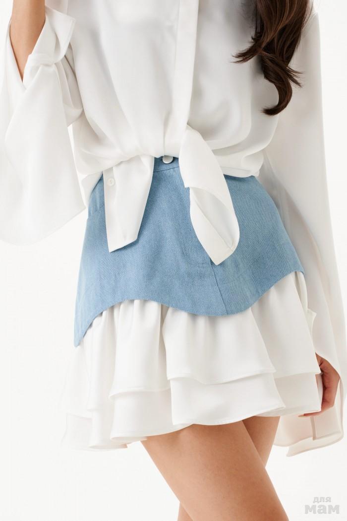 Юбка силуэта "трапеция" молочного цвета, короткая, на подкладке. В среднем шве заднего полотнища юбки обработана потайная застежка молния.