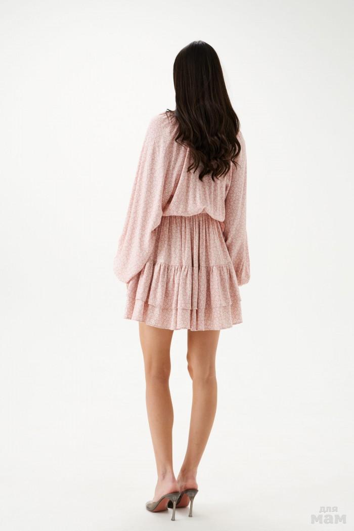 Платье полуприлегающего силуэта выполнено из розового полотна с белым цветочным принтом.
