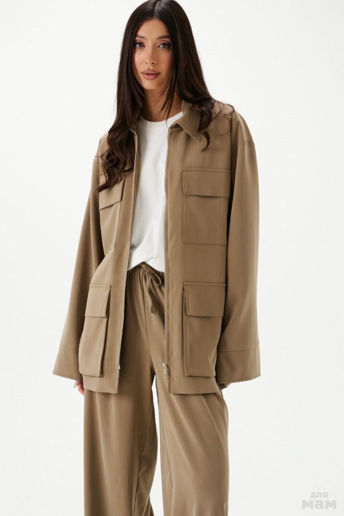 Характеристики: приталенный силуэт, воротник-стойка, по переду притачная планка, линия плеча спущенная. На уровне груди и колен прямоугольные накладные карманы, в боковых швах брюк потайные карманы. В комплекте пояс-завязка из основной ткани. Длина спинки 42 см, длина рукава 60 см.