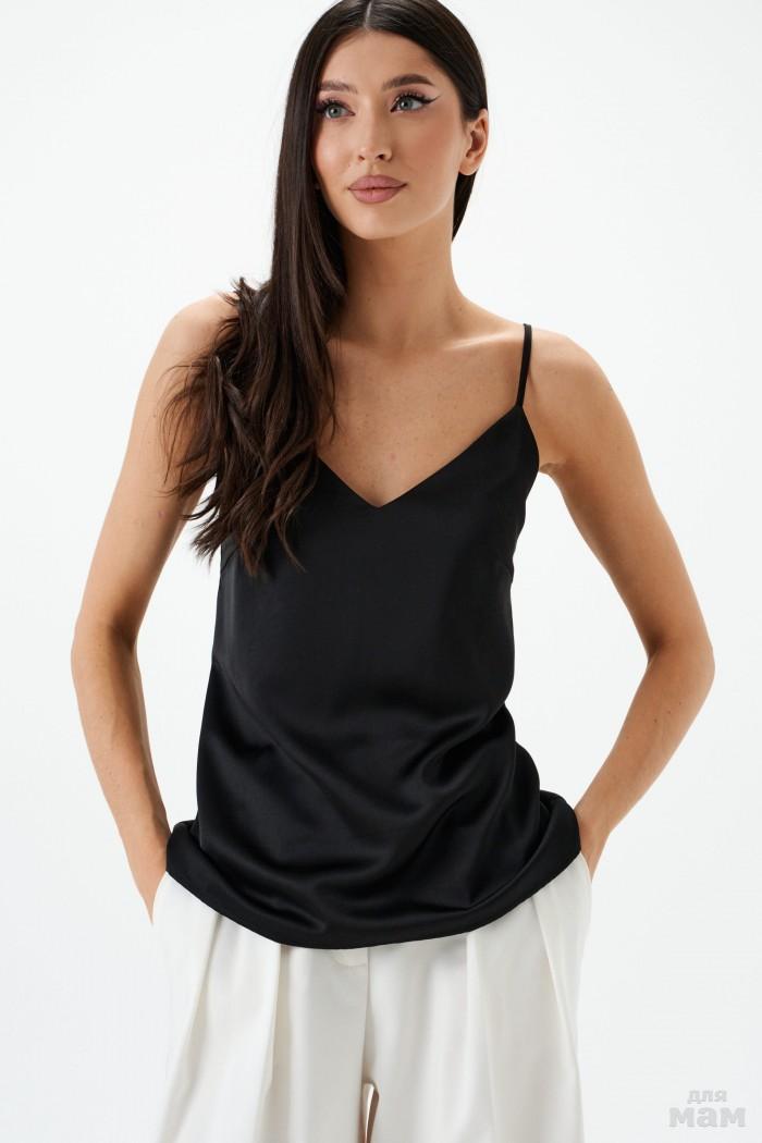 Топ укороченный. Выполнен из костюмной ткани чёрного цвета. Вырез декольте квадратный. Широкие бретели. Есть подкладка. Спинка закрытая. По низу изделия брендированная резинка. Застёжки нет. Длина спинки 41 см